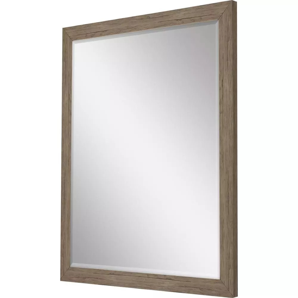 Elegant beveled mirror is framed in a block profile moulding in a distressed wood finish.