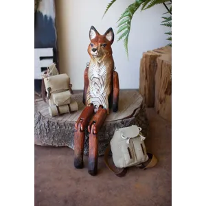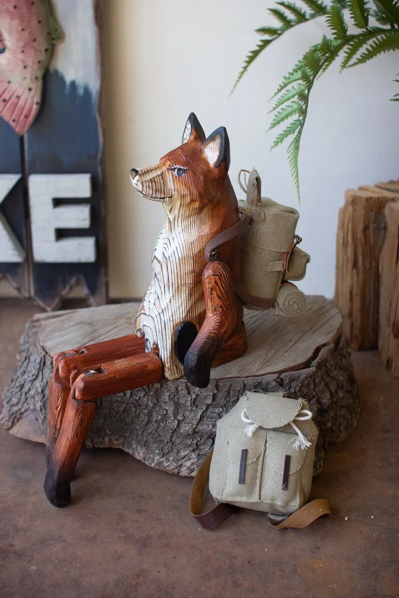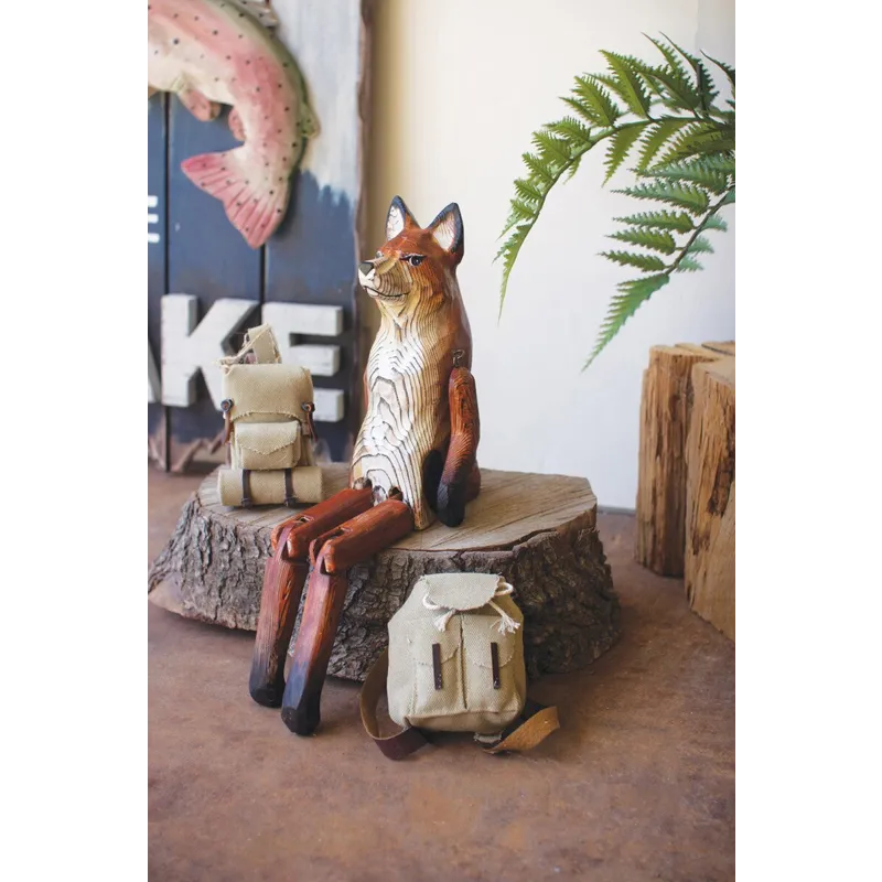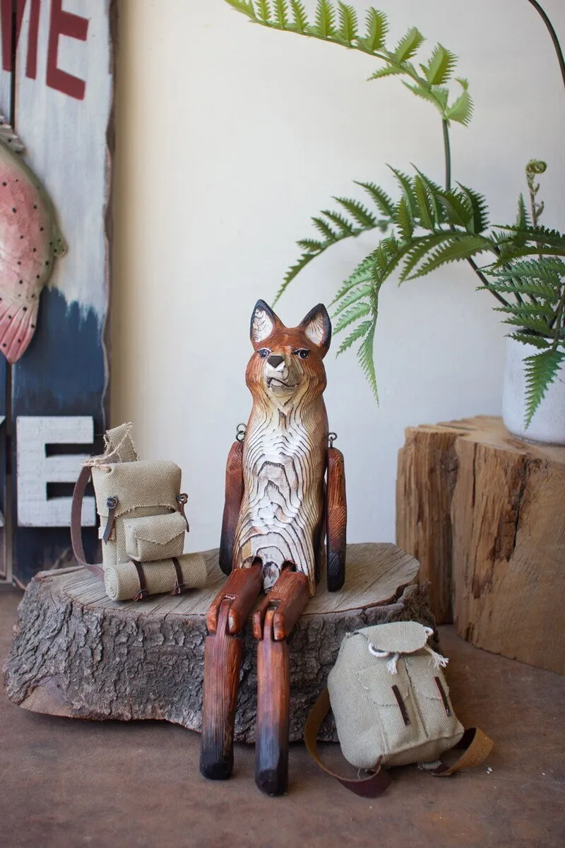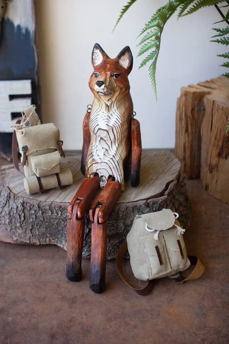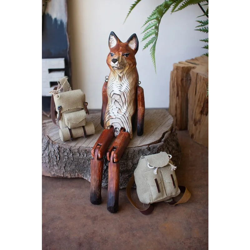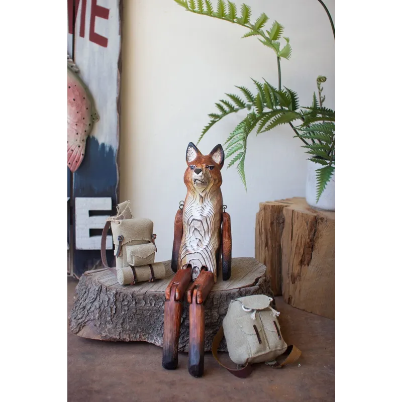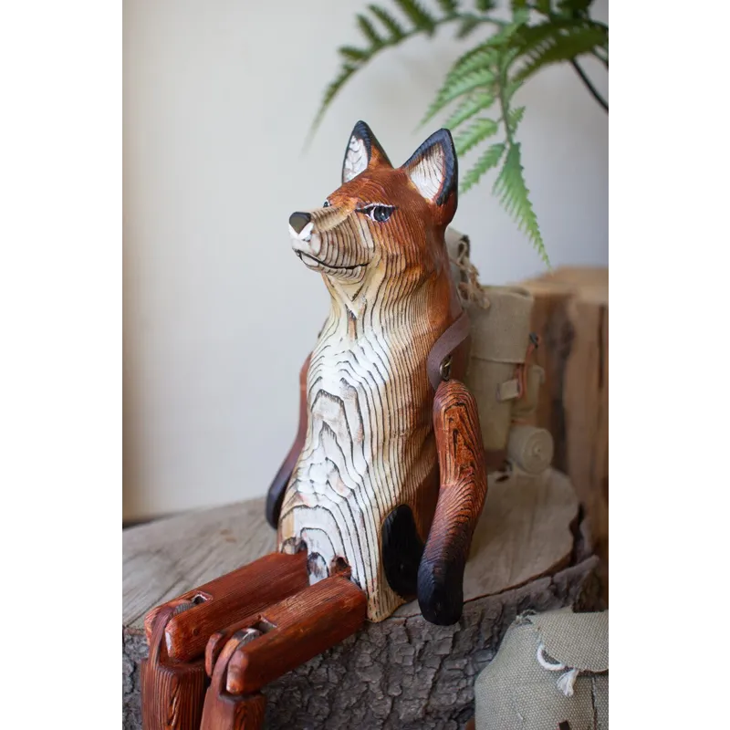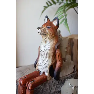 What does the fox say? This one is content to charm on a shelf or book stack. The carved wooden fox shelf sitter is 15" tall with movable hips, knees, and shoulders.