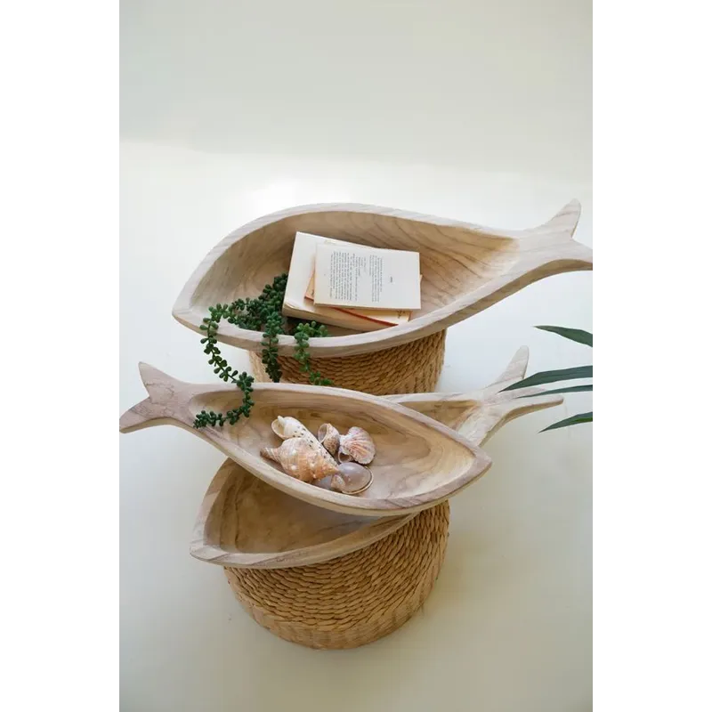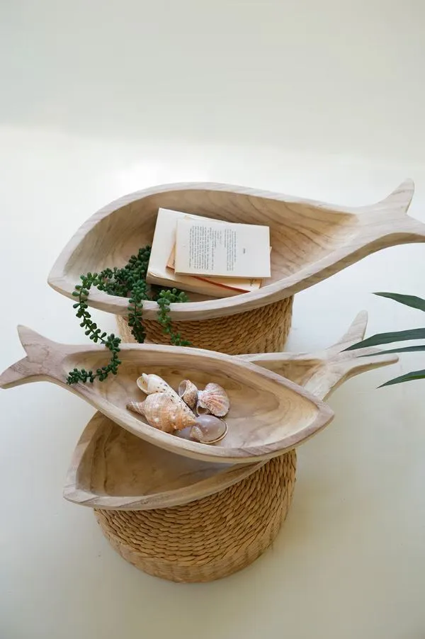 Catch the day's haul on this set of three carved wooden fish platters. You can set the sideboard for the whole family or use these fishy platters for decor display at your seaside or lakeside getaway. These fish platters are neutral enough to suit any decor style.