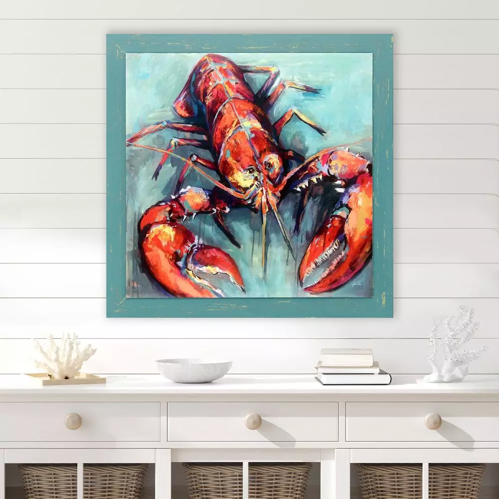 A bright red lobster features a hand applied enhanced gel finish. Mounted to a hand painted blue wood frame with distressing.