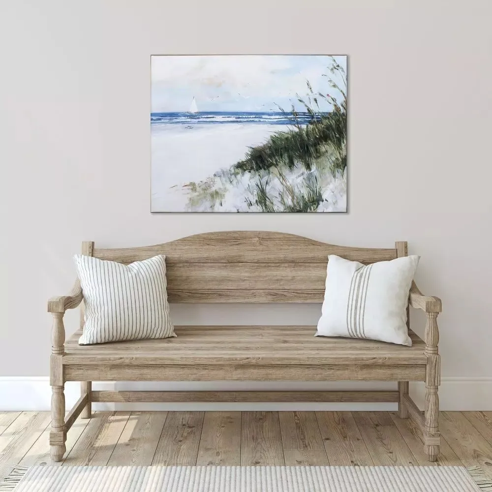 Lovely seascape image on a stretched canvas that has been finished with a wood look frame.