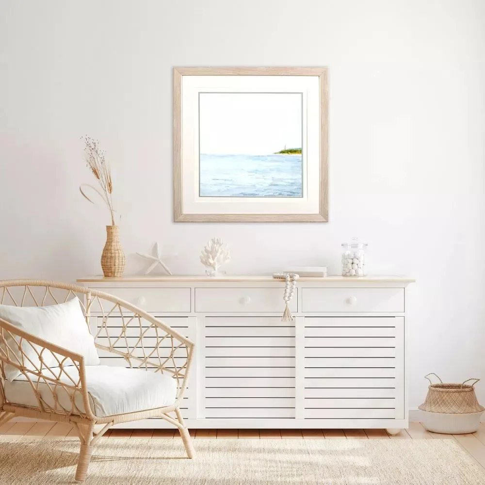 A coastal boat print triple matted under glass paired with a light textured wood tone frame.
