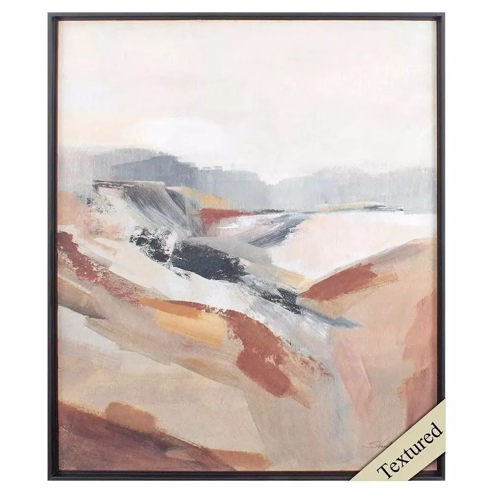 An abstract landscape scene with a hand applied acrylic overlay. This non glass piece is finished with a matte black frame.