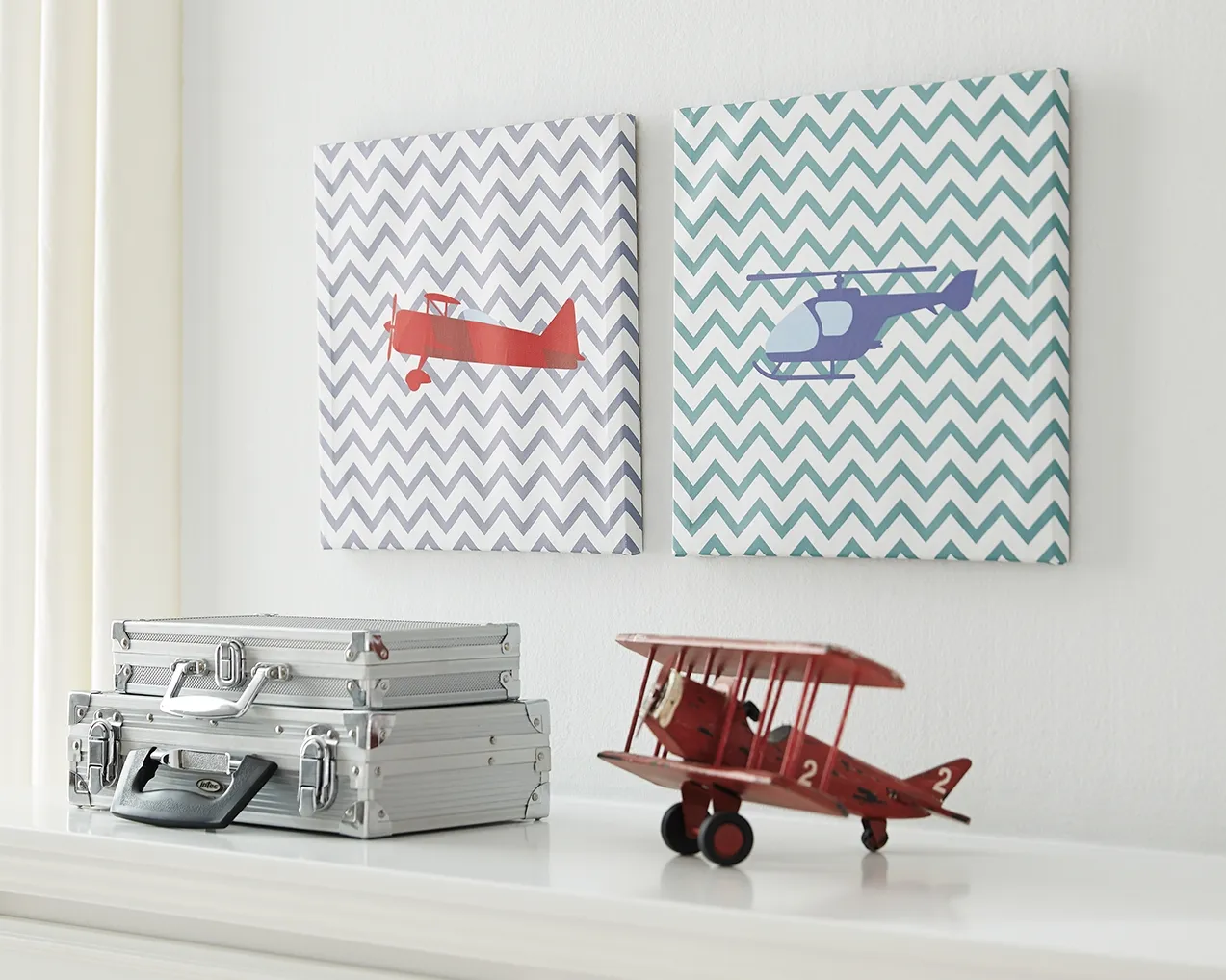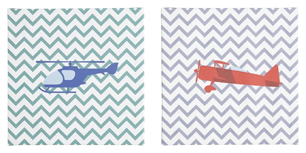 Whether you're taking off or coming in, expect to land a great find with this 2-piece wall art set. Red and blue aircrafts fly against chevron skies in green and gray. Designed on gallery wrapped canvas, it's perfect for any plane lover.