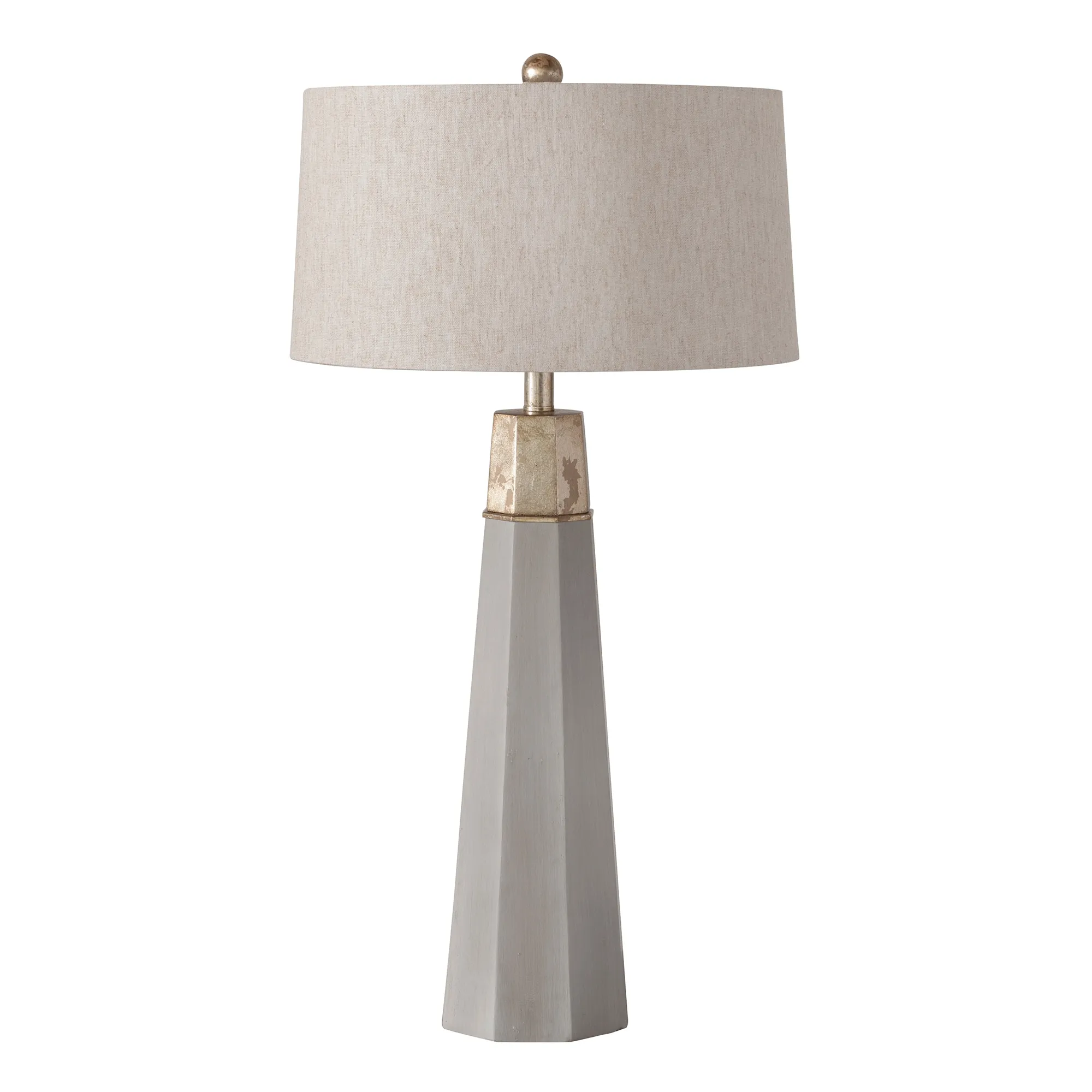 This smooth tapered base finished in a washed soft gray with a champagne leaf metal fitting and a beige linen shade.