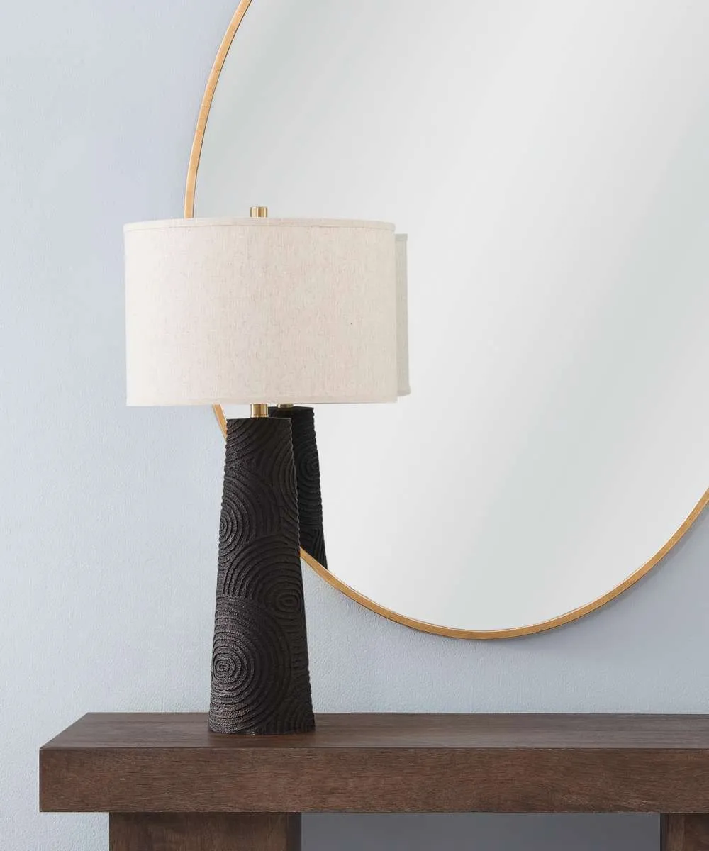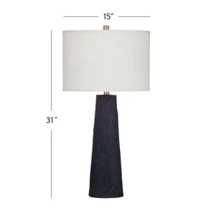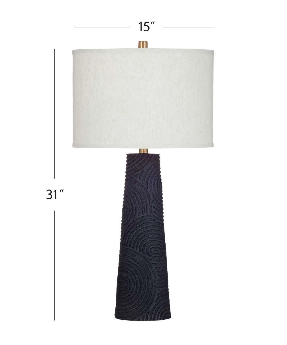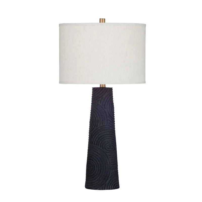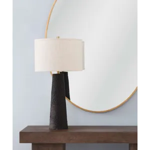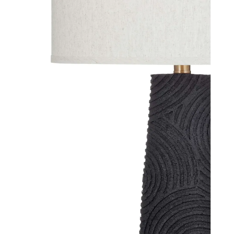 The Merrick Table Lamp is crafted of resin with a drum shade. Finish: black. The hand-crafted details produced by a skilled artist lends itself to a unique technique and will vary slightly.