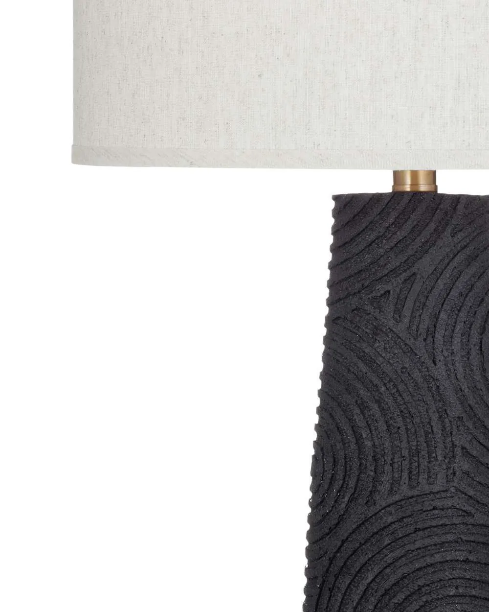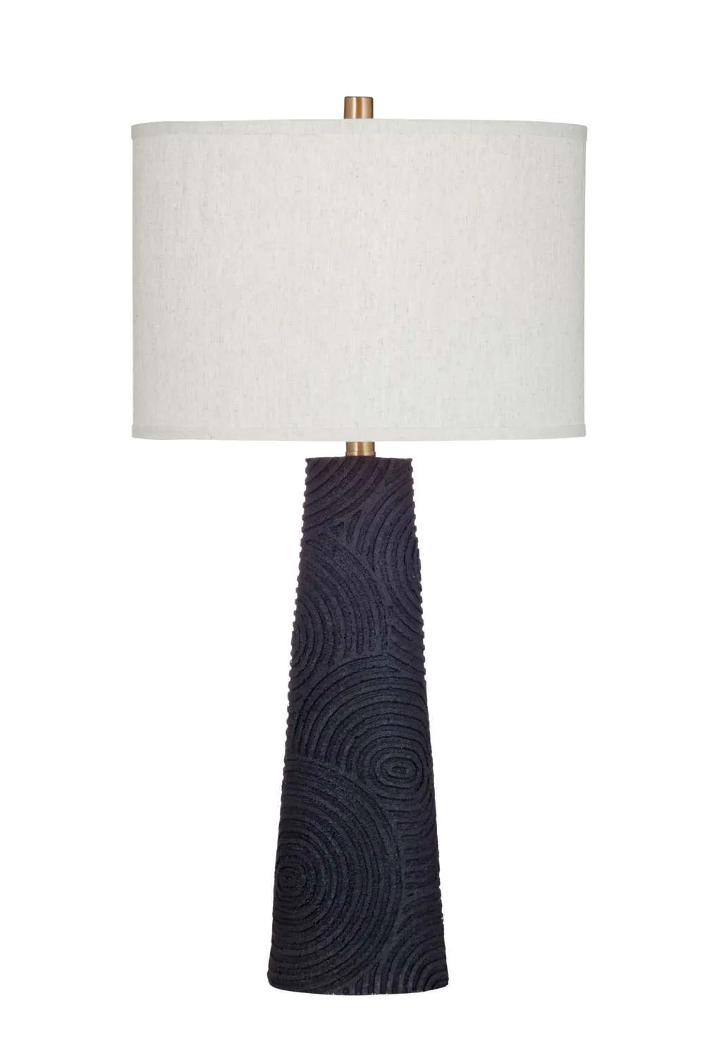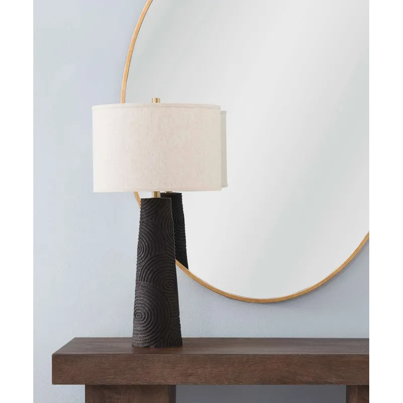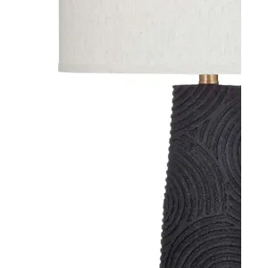 The Merrick Table Lamp is crafted of resin with a drum shade. Finish: black. The hand-crafted details produced by a skilled artist lends itself to a unique technique and will vary slightly.
