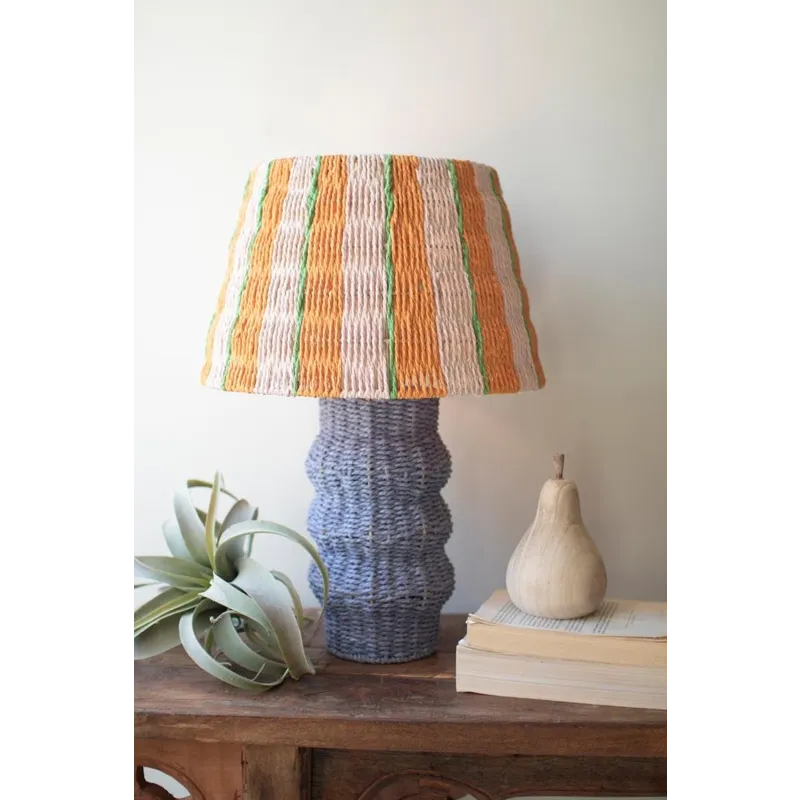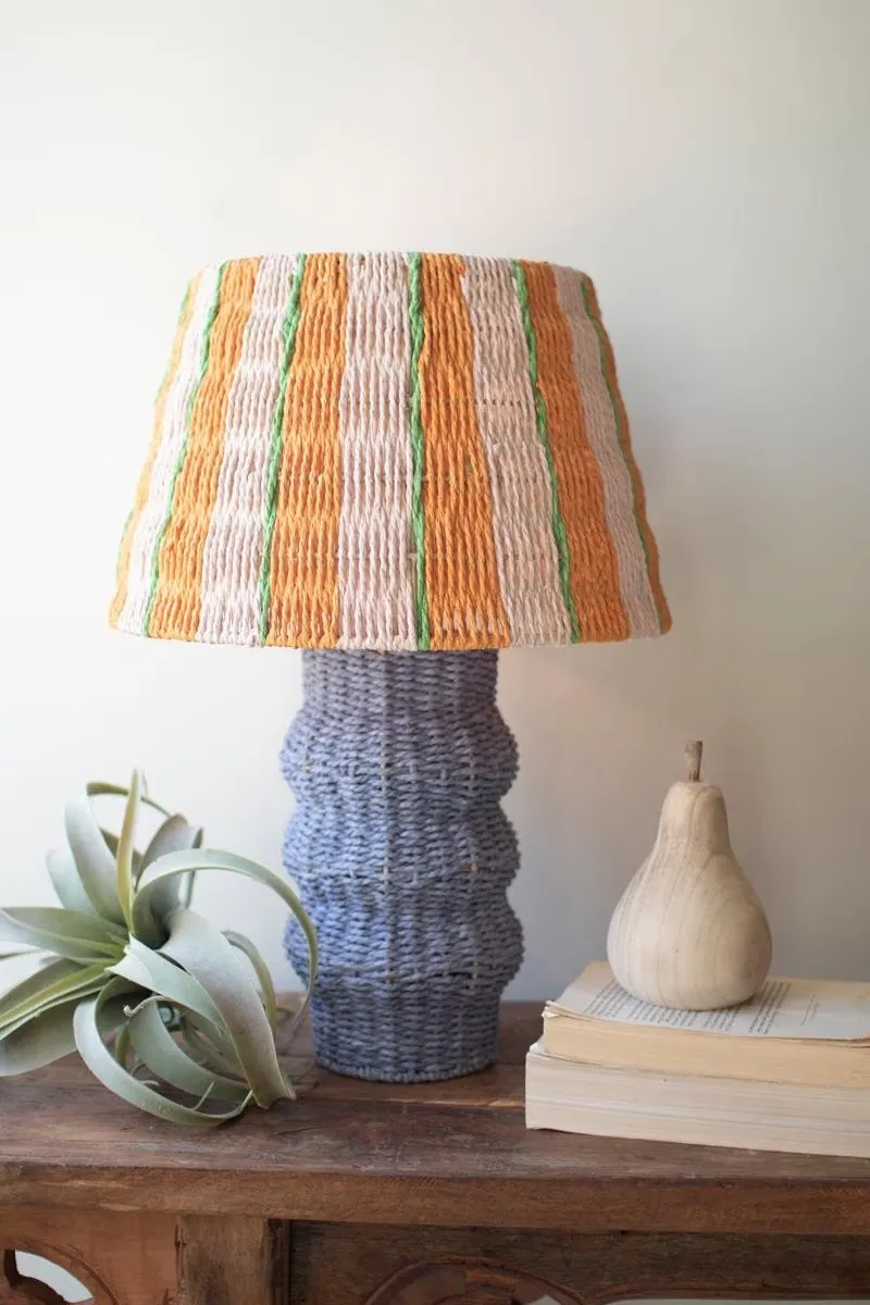 Illuminate a corner with this recycled paper rope and iron table lamp. The shade is an orange green and natural stripe and the base is a blueish gray. This lamp brightens any space.