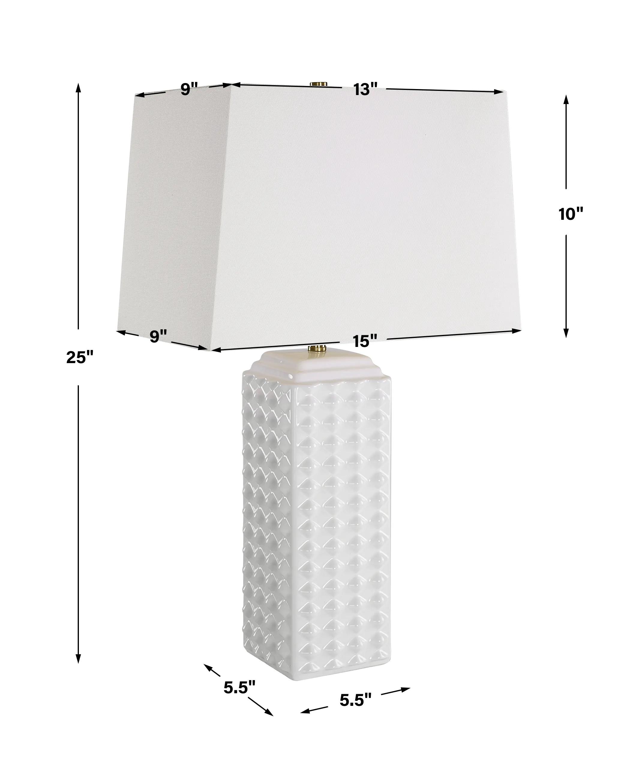 This fun, 25" square body ceramic table lamp is designed with organic diamond shaped knobs and finished in a gloss white. The rectangular hardback shade is a white linen fabric with light slubbing.