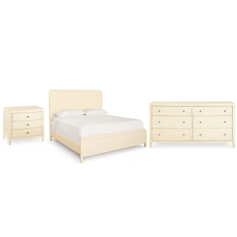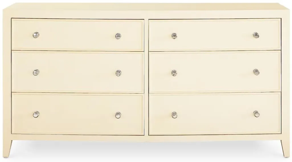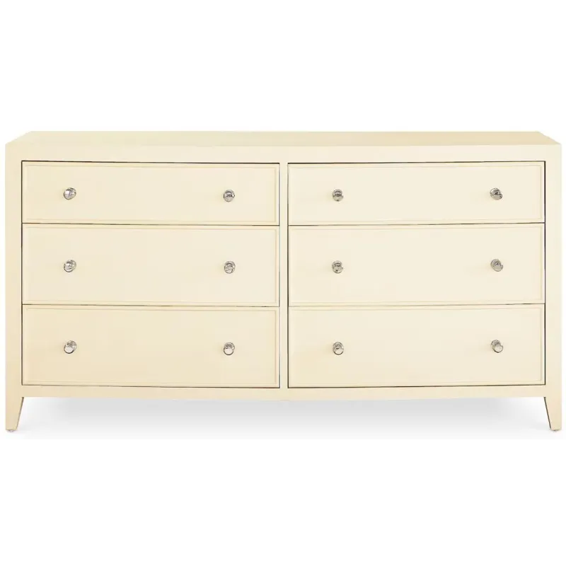 Newbury 6 Drawer Dresser (2944-0237): 68 x 21.5 x 35 - With frame detailing and the gentle curve of its coved front, the Newbury 6 Drawer Dresser brings a smooth sophistication to your bedroom. Like the rest of the Newbury Collection, textured available finishes are crafted into a dynamic combination of straight lines and curves. Accessed by their polished nickel beehive knobs, six symmetrical drawers provide substantial storage. The side panels are framed with a raised border and the dresser stands regally on slightly tapered legs. The Newbury dresser is destined to heighten the style in any bedroom from classic to modern. Offered in textured White Oak or Parchment Gesso finishes.