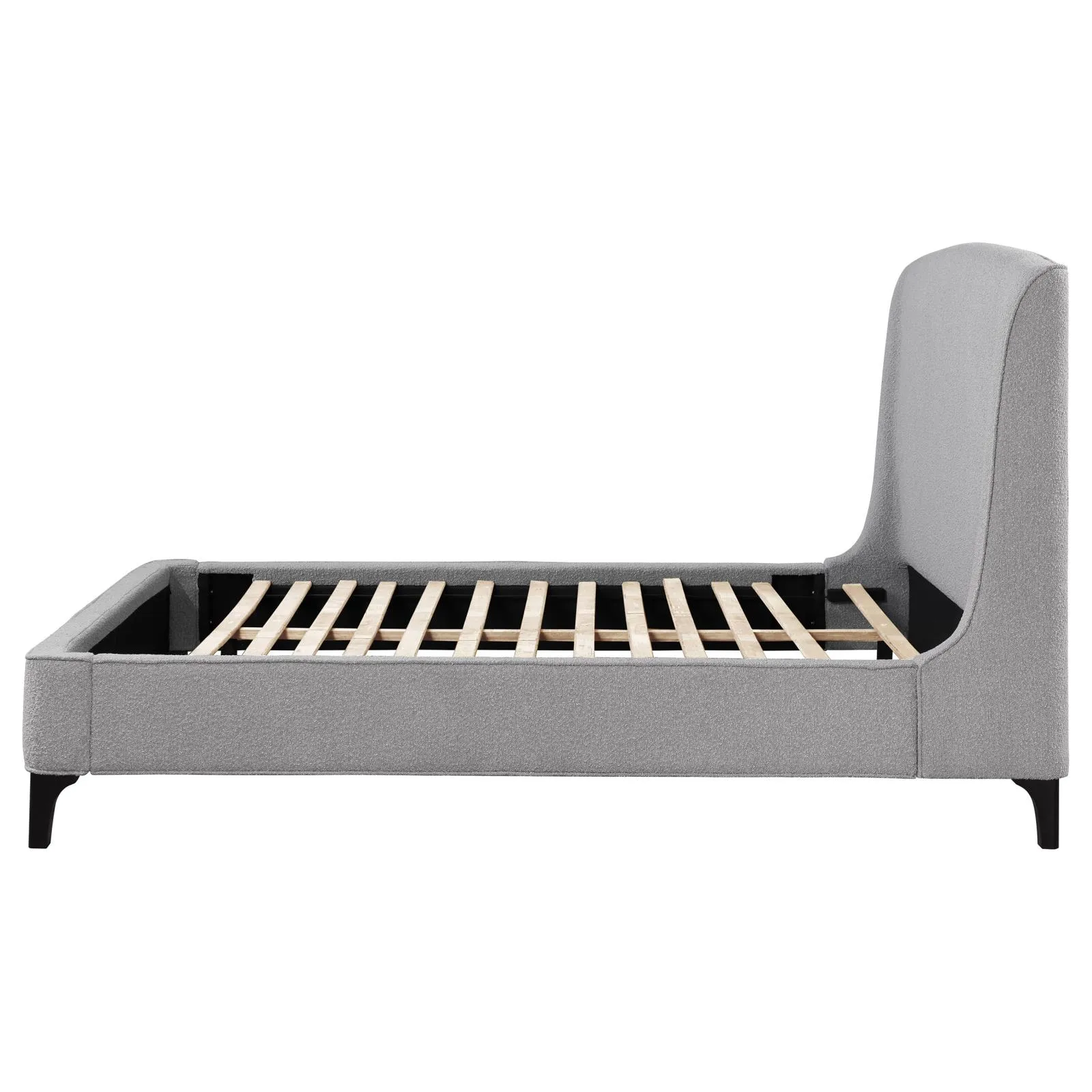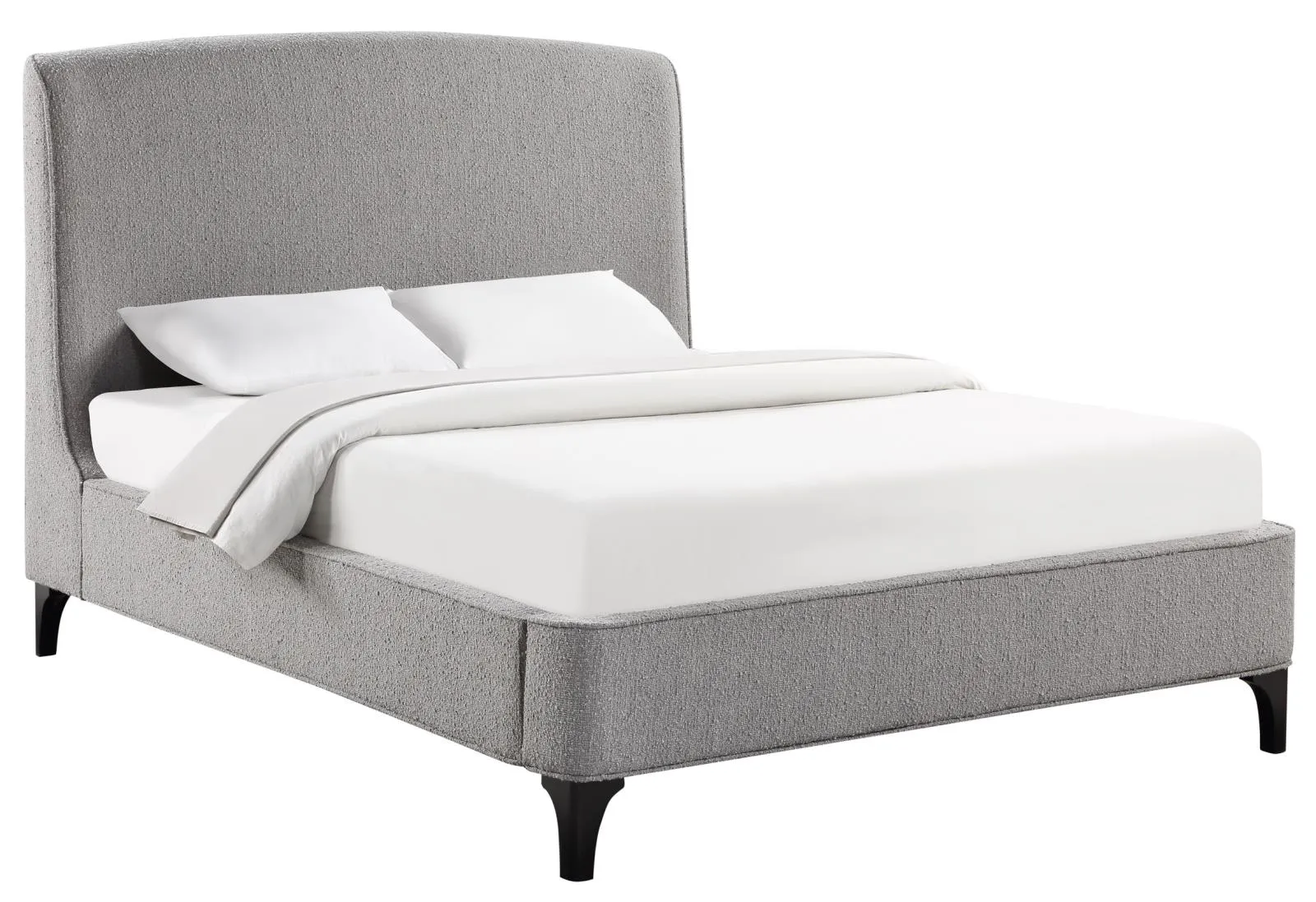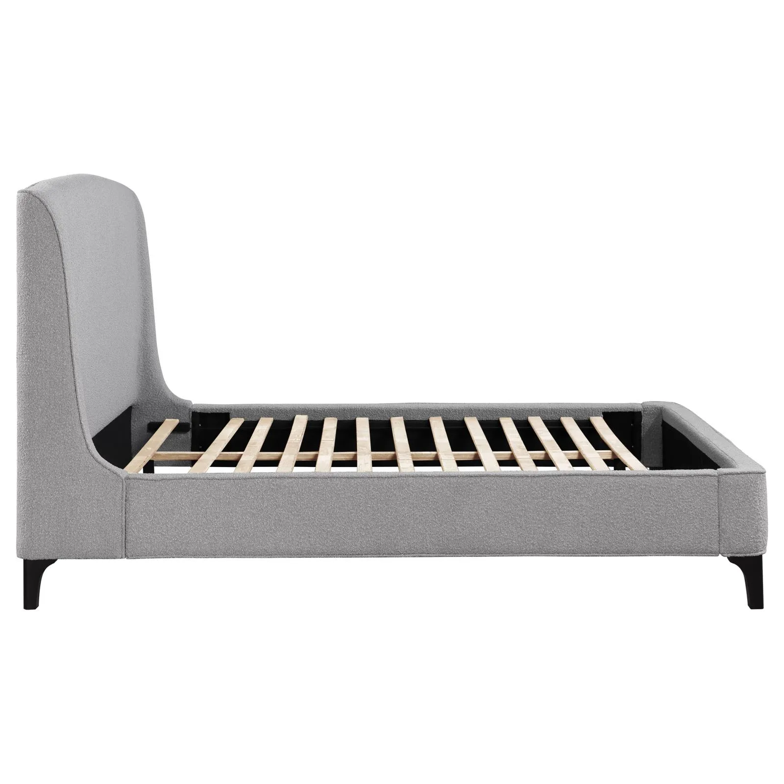 Add a touch of style and comfort to your bedroom with this upholstered bed. Its gentle curved headboard and thick sides are padded with trendy grey chunky boucle fabric. The whole frame is covered in the same soft fabric, creating a cozy and inviting look. The texture adds sophistication, making it a visually stunning piece that is both comfortable to sit on and admire from afar.