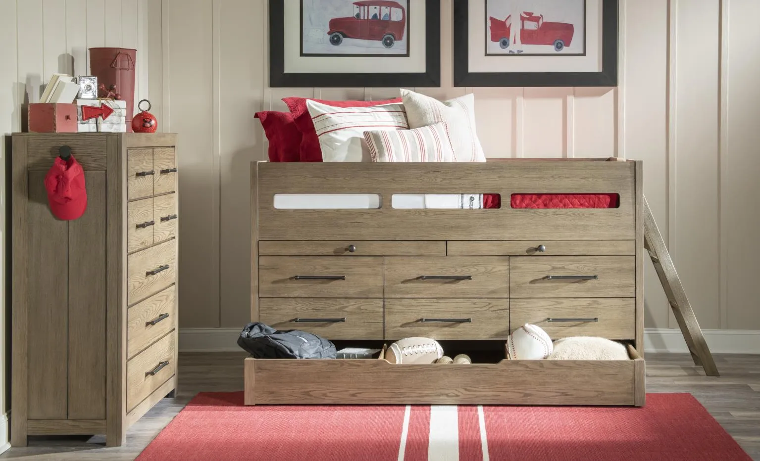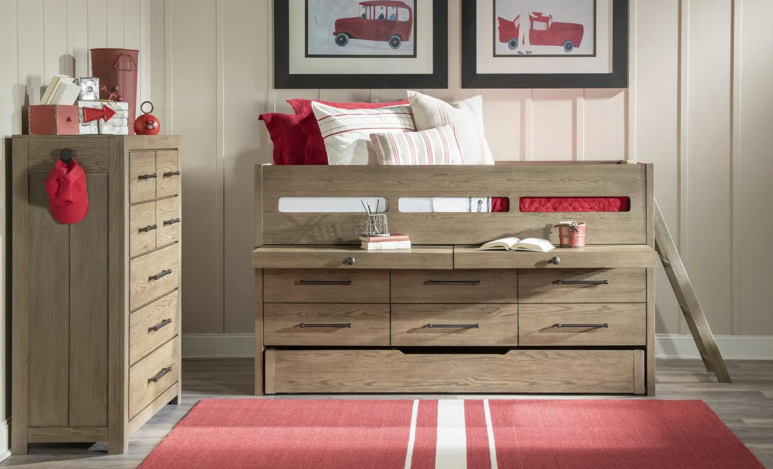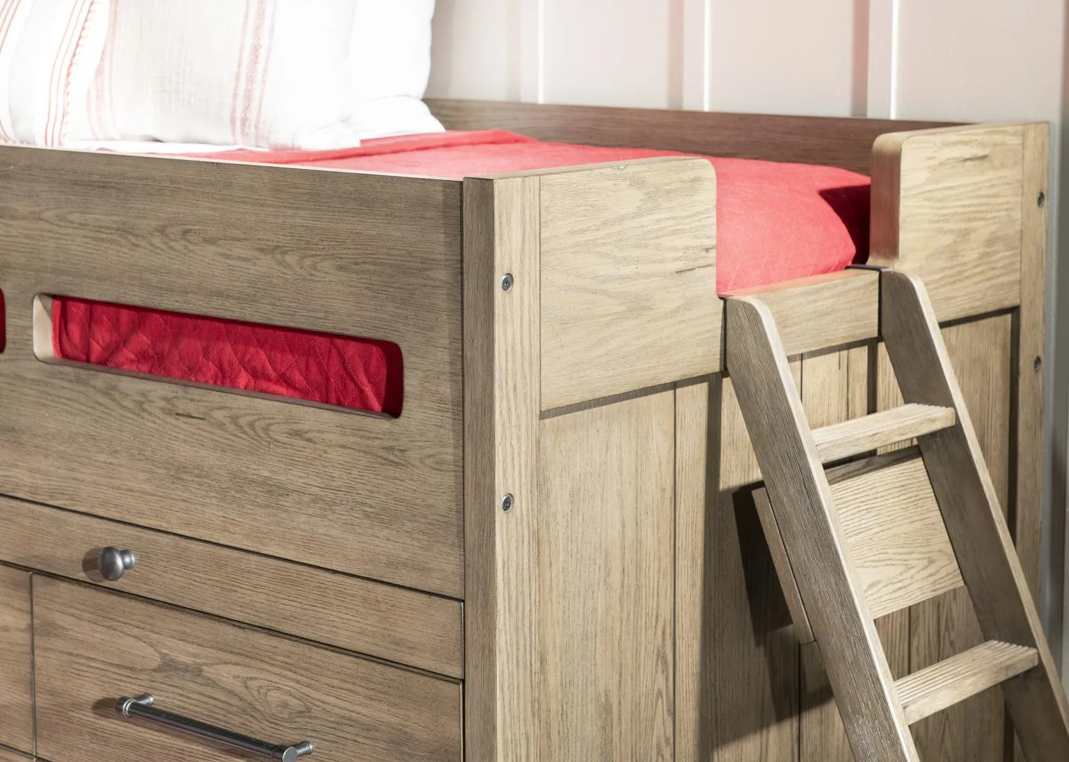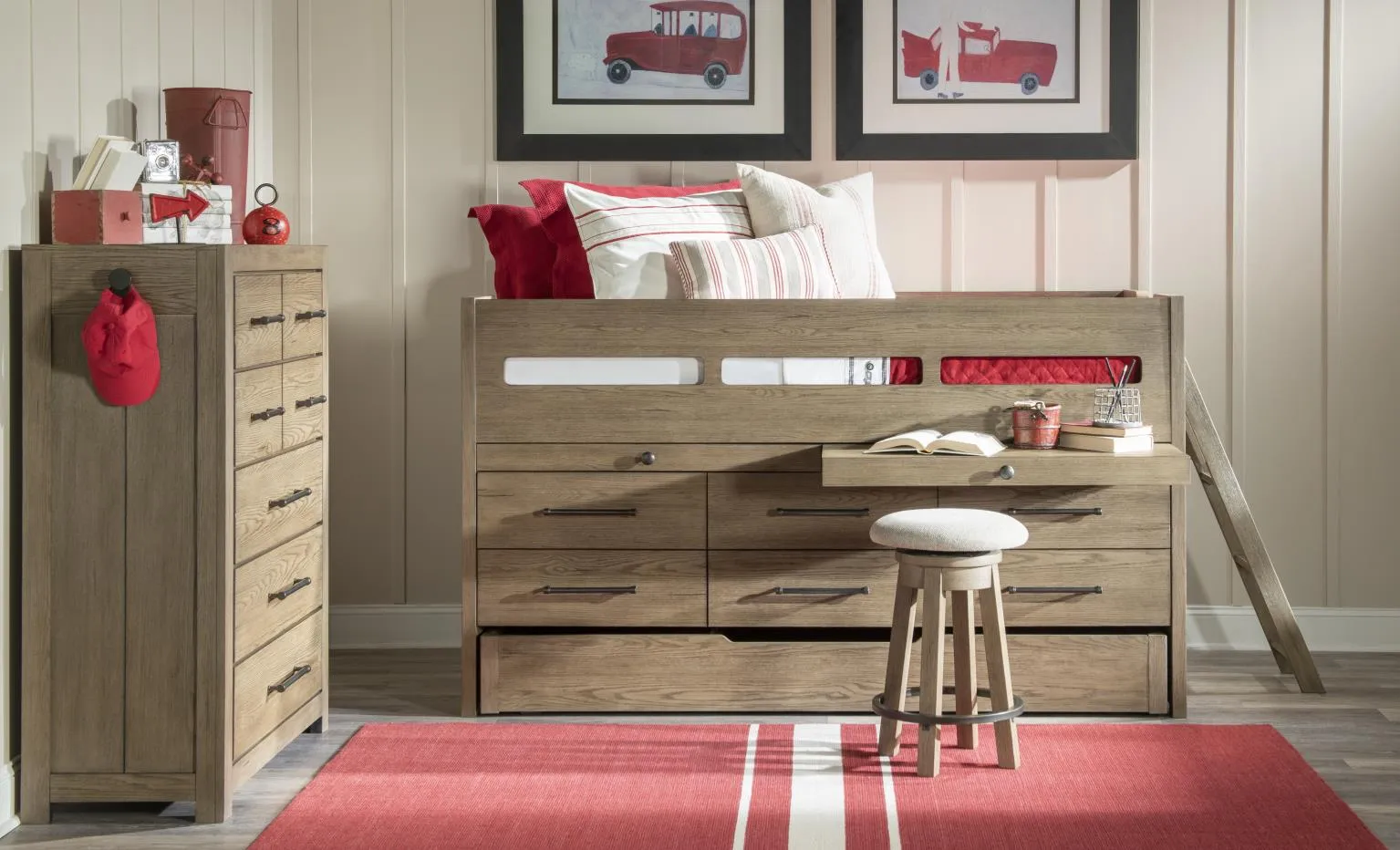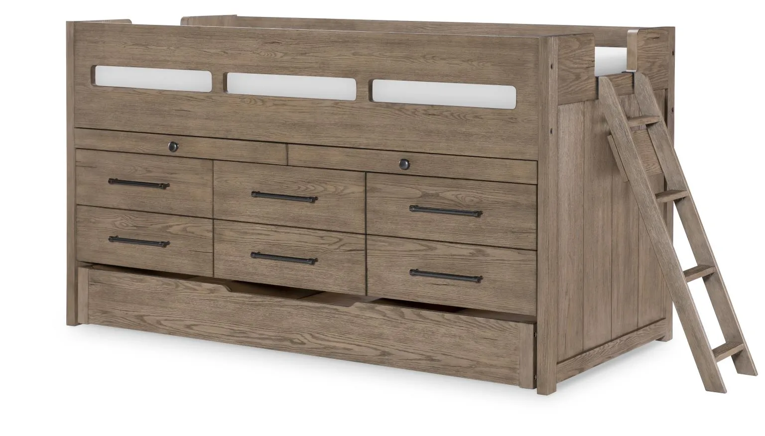 The Wyatt collection combines rustic charm with modern functionality. The weathered stone finish exudes warmth and character. Rustic Pewter bar pulls complete the look. Choose between the slat panel bed or captain's bed, complete with spacious drawers and slide-out workspaces for homework or creative projects. The convenient trundle option is perfect for sleepovers or additional underbed storage. The elevated desk features ample drawer and door storage, plus a light to brighten any task. Power outlets and USB charging ports on select pieces allow you to easily plug in lamps and charge electronics.