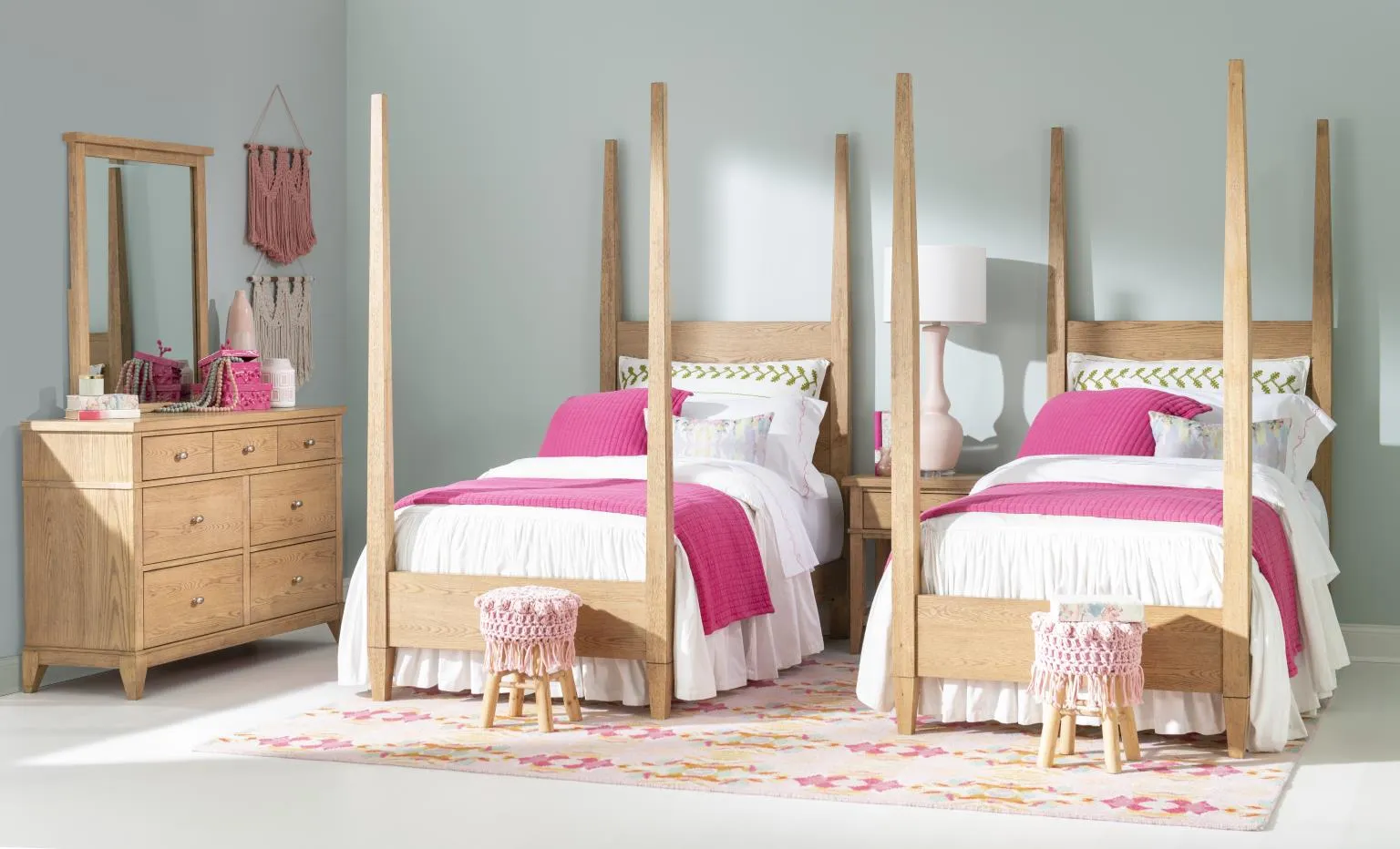 Today's Traditions Youth from Trisha Yearwood Home offers updated traditional styling with a nod to Shaker and Farmhouse influences. The banding on upper cases and beds, along with the tapered legs, gives dimension and appeal. Random board selection gives each piece a hand-built look. The soft distressing and burnishing on the Hickory finish gives each piece a generational appearance. The Blacksmith finish offers a beautiful dark tone that can stand alone or be mixed with the Hickory finish. Oiled Bronze hardware completes the look. Twin and Full-Size Poster and Panel beds are offered. A twin-over-twin and twin-over-full bunk is also available.