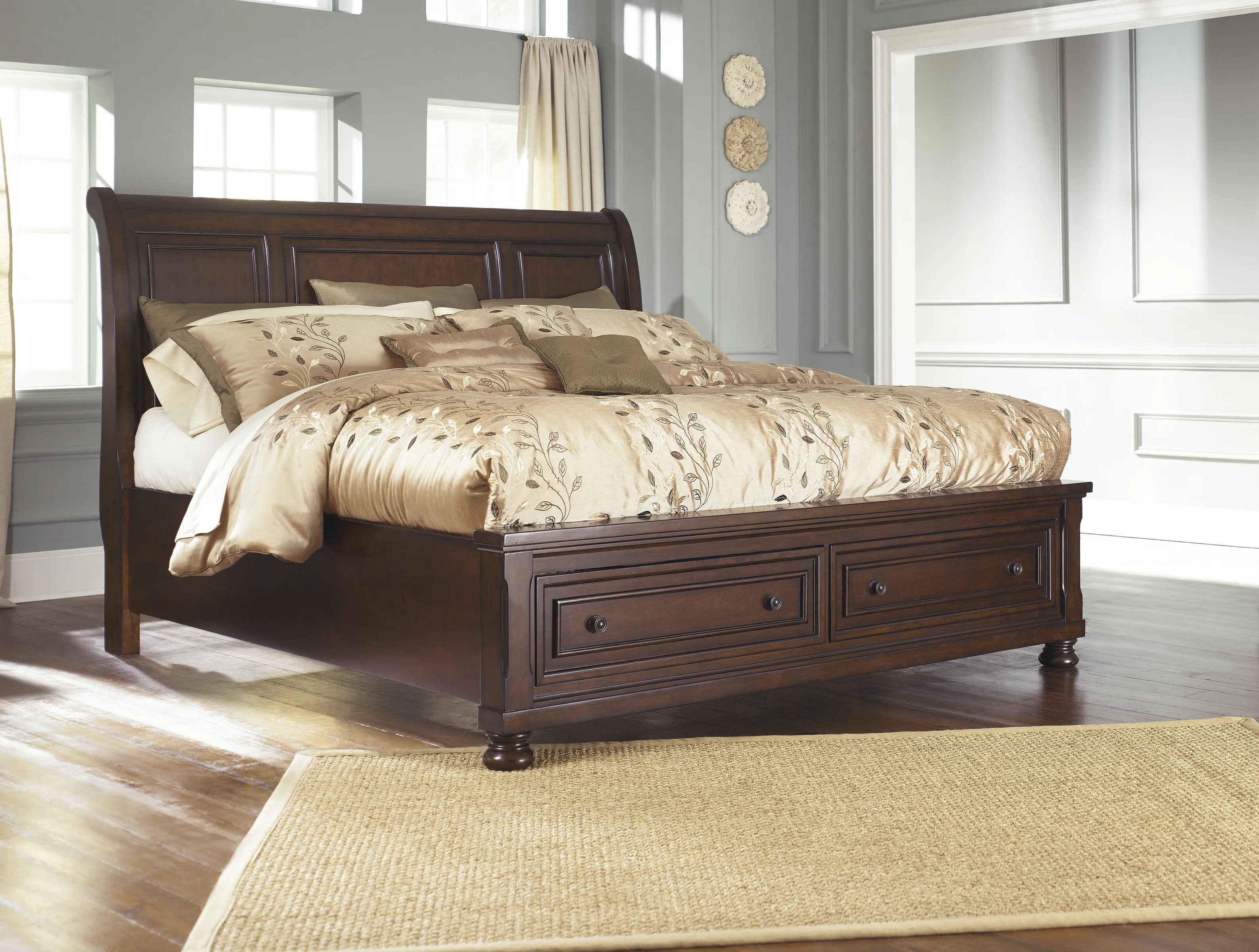 Those drawn to the warm, rustic feel of vintage-inspired interiors love how the Porter sleigh headboard suits their style. Rustic finish is rich with character, while beveled panel framing reflects beauty in the details. Made with select cherry veneers and hardwood solids. Burnished brown finish. Drawers feature a dark bronze color knob and backplate. Dovetail drawer construction. Drawer interior with color finish. Ball bearing drawer glide. Felt or cedar drawer bottoms. Beveled mirror. Sleigh bed features storage in the footboard.