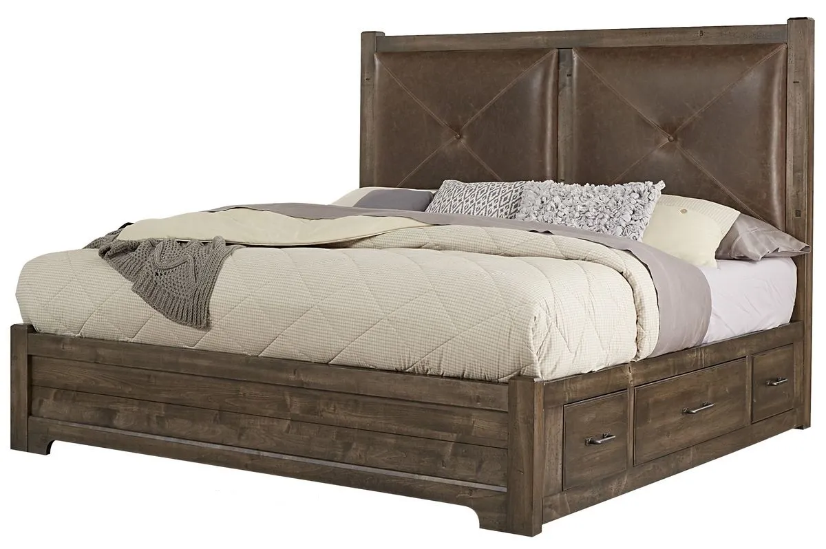 Give your bedroom the comforting rustic charm you've been dreaming of with this solid wood queen bed. The leather upholstered headboard provides an inviting atmosphere you'll relish coming home to night after night. A total of six drawers with three on either side of the bed offer up plenty of convenient storage for extra bedding or even clothing that you need extra space for. The solid maple construction of the bed allows for you to rest easy knowing that this charming piece will last for years to come.