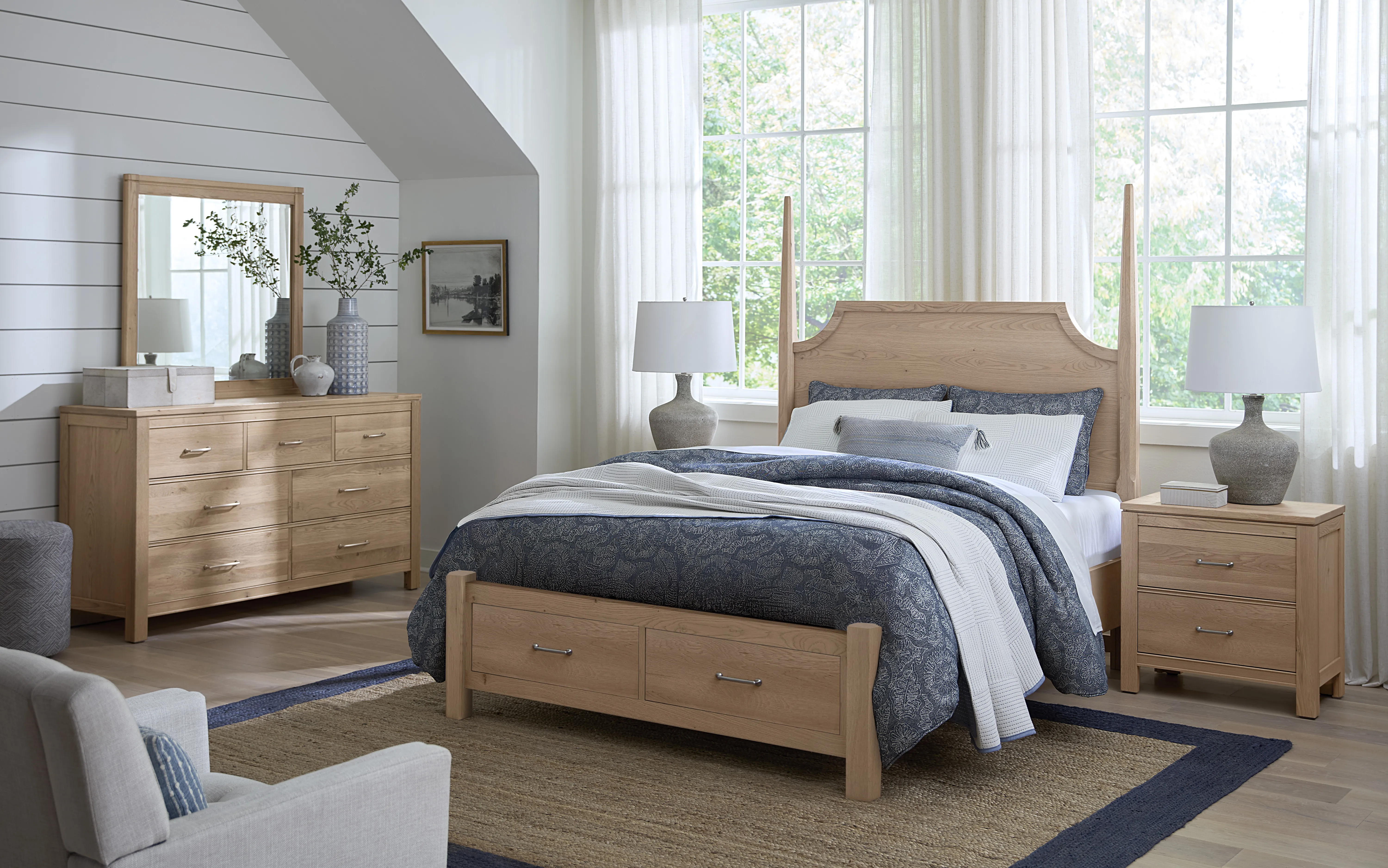 This High/Low Pencil Post Bed with footboard storage presents a tall; elegant silhouette. It's fashioned from Solid Oak; American-grown hardwood