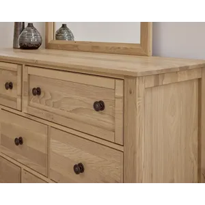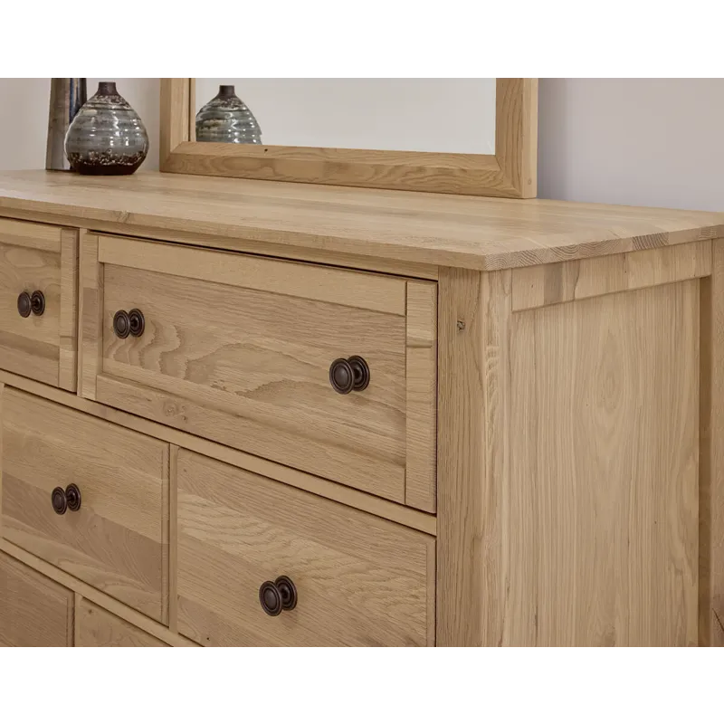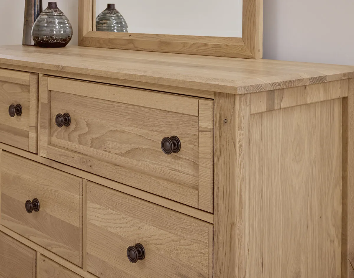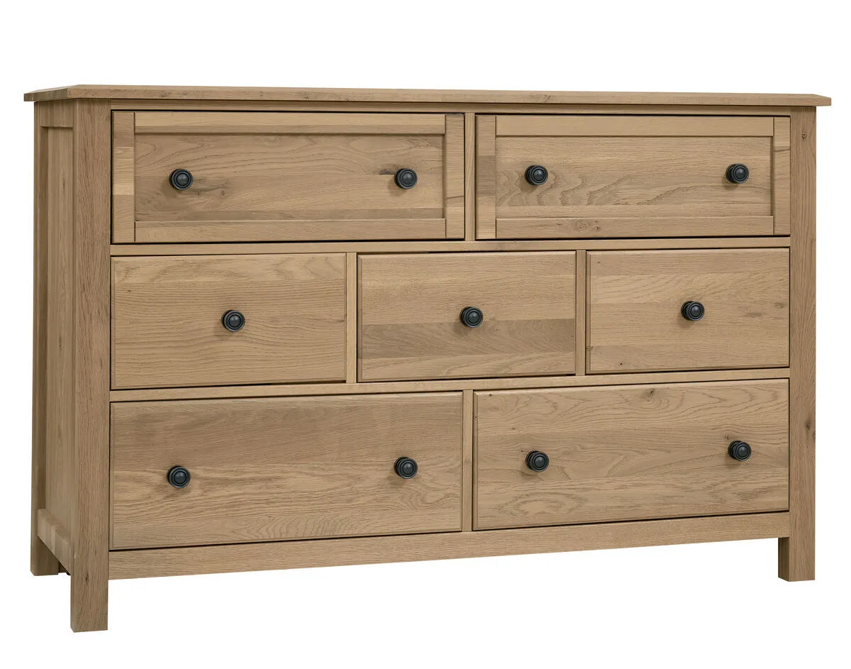 Made in the USA; this dresser shown in clear oak finish has seven drawers and is made from solid American White Oak. Its design elements create a look that fits farmhouse; loft; cottage; and coastal spaces. Available in 5 quick ship finishes.