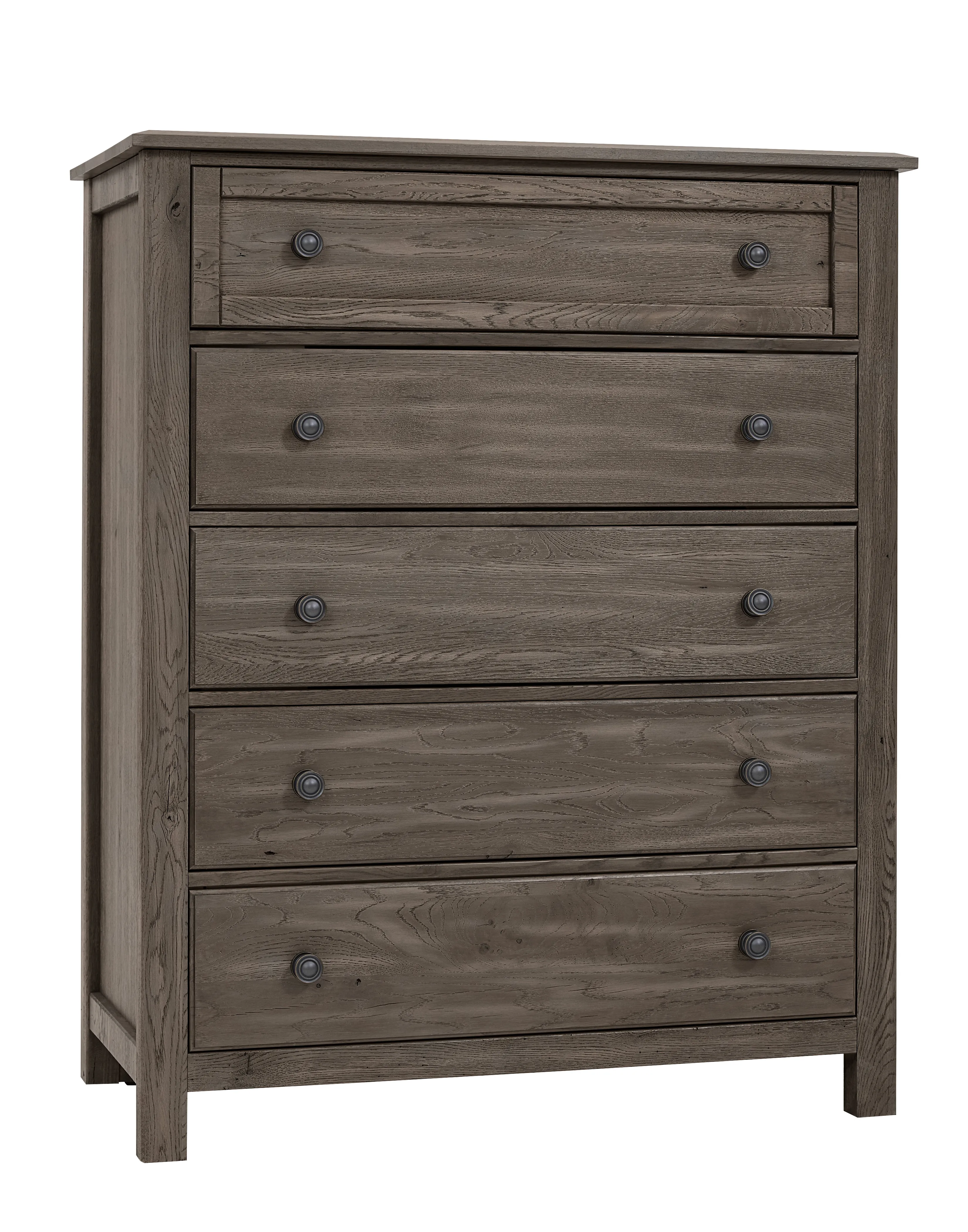 Made in the USA; this chest with five drawers shown in driftwood grey finish offers casual style to any bedroom in your home. Made from solid American White Oak. Available in 5 quick ship finishes.