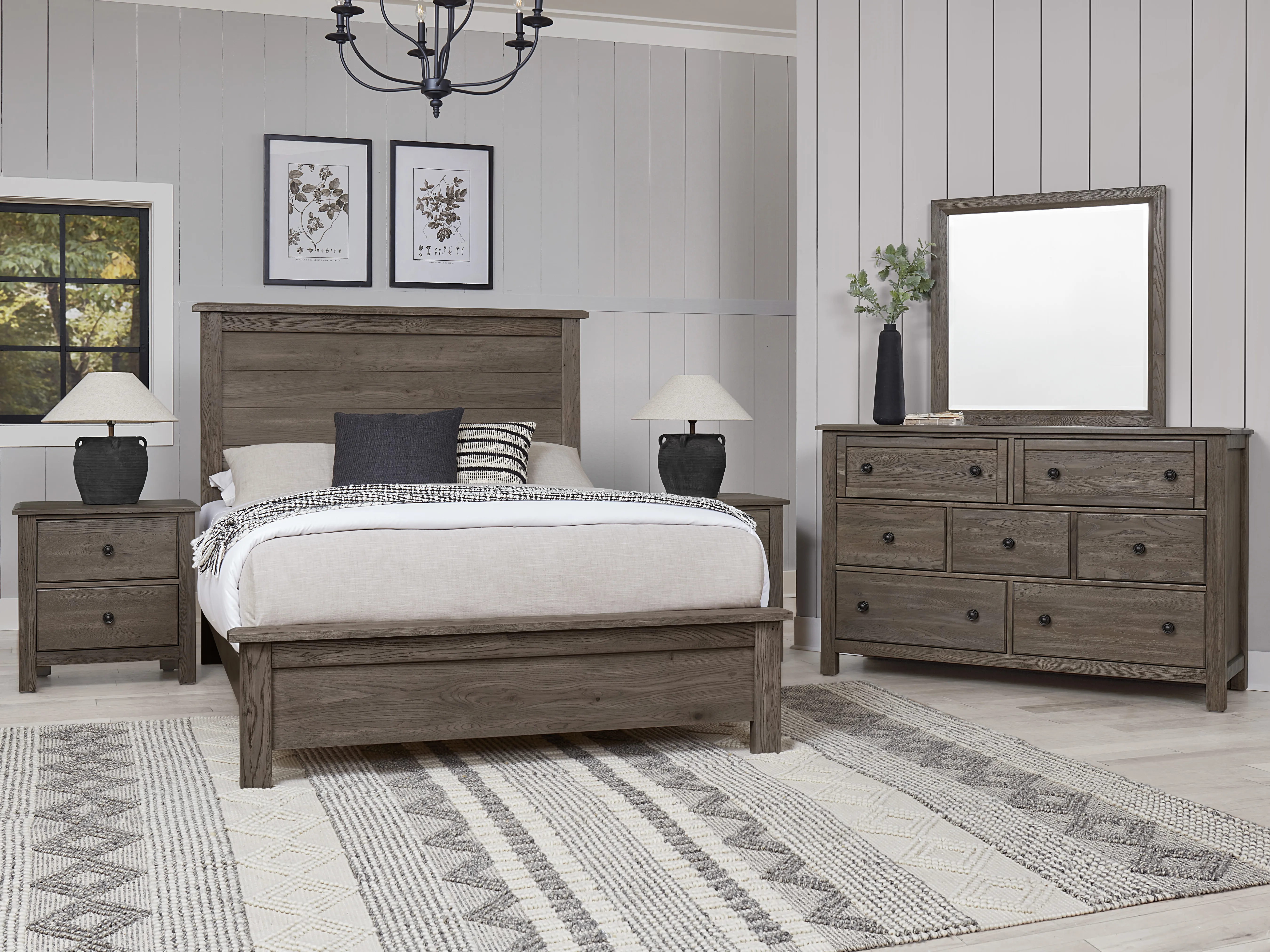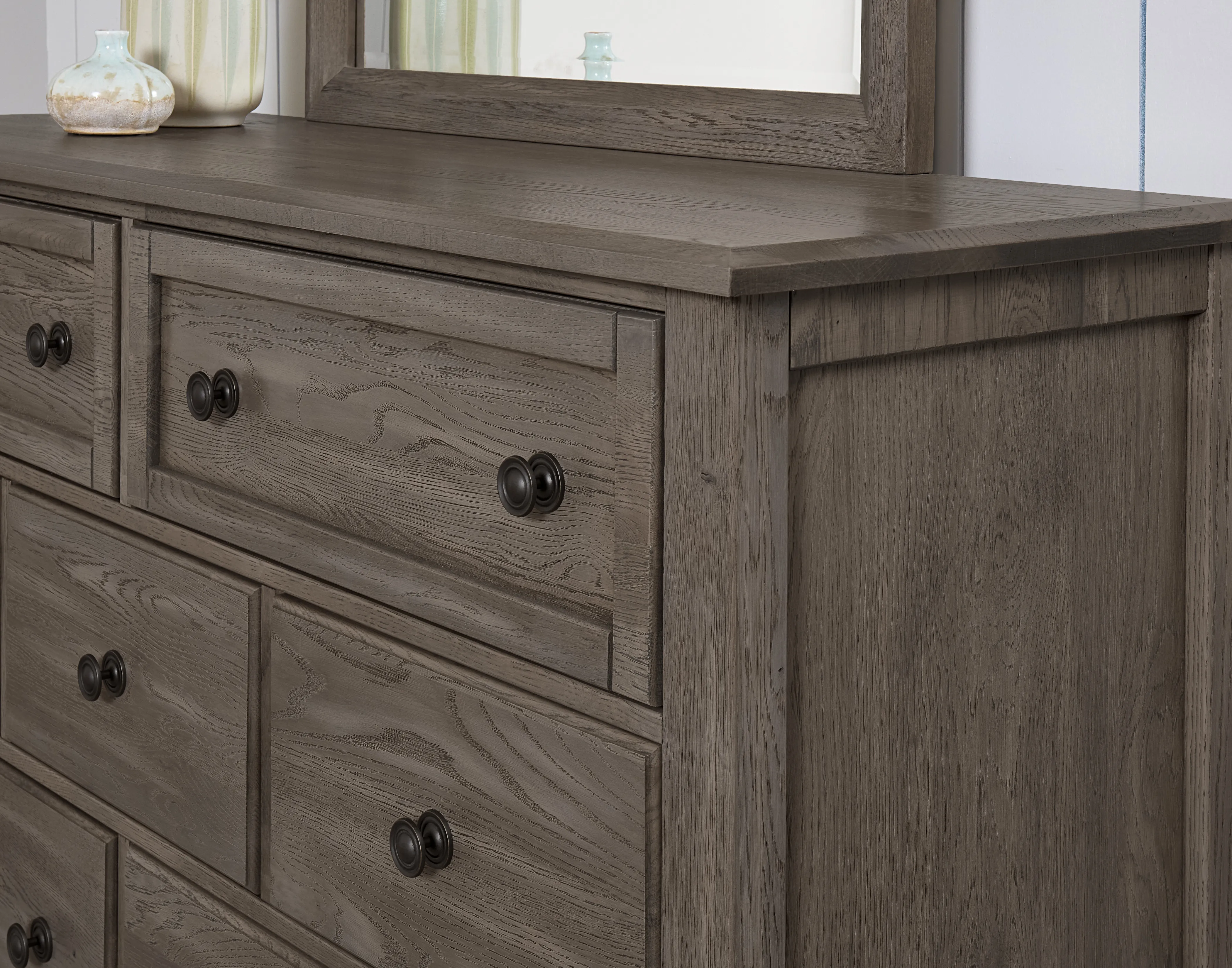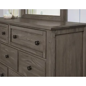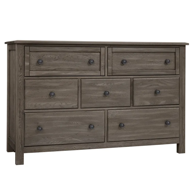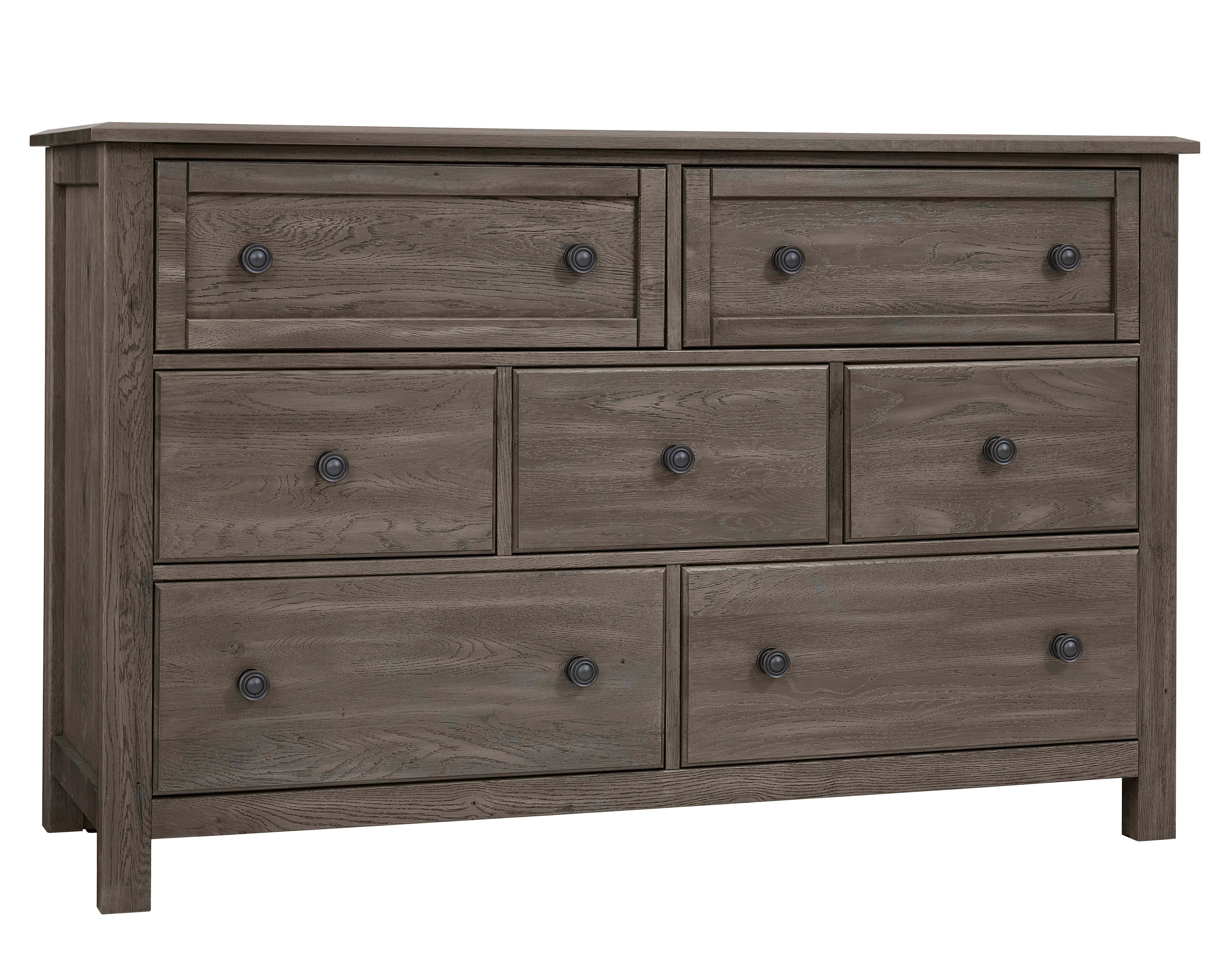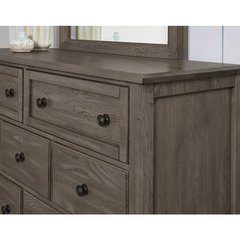 Made in the USA; this dresser shown in driftwood grey finish has seven drawers and is made from solid American White Oak. Its design elements create a look that fits farmhouse; loft; cottage; and coastal spaces. Available in 5 quick ship finishes.
