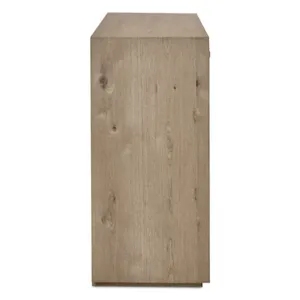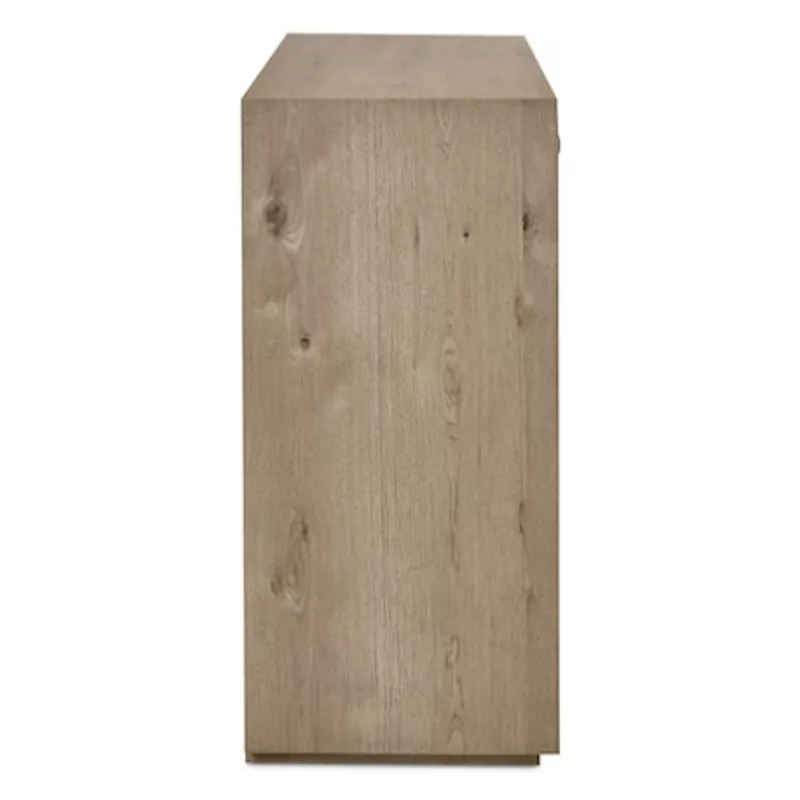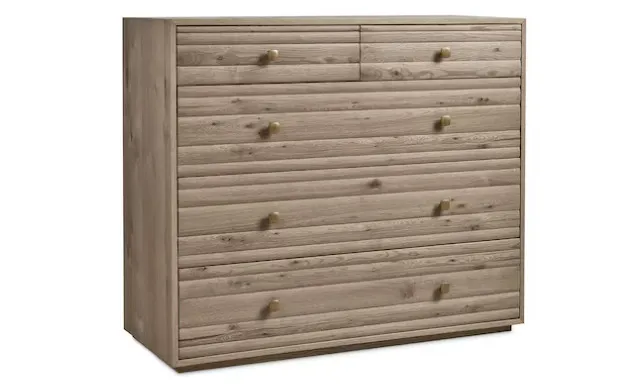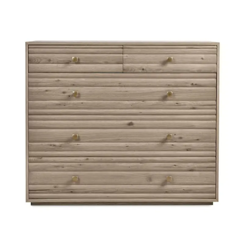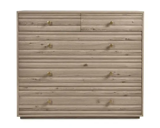 Featuring a horizontal application of the collection’s signature reeding, the Andora 5-Drawer Chest stacks your bedroom storage with Modernist-inspired élan. Two half-width drawers sit atop 3 full-width drawers, all of neo-rustic, irregularly-planked oak. The chest’s clean-lined silhouette provides a simple balance to the complexity of the textured surface, adding subtle sophistication to your design plan. The chest floats on a plinth base and is adorned with sand-cast, organically-shaped drawer pulls. Like the rest of the Andora collection, the chest is available in three finishes.