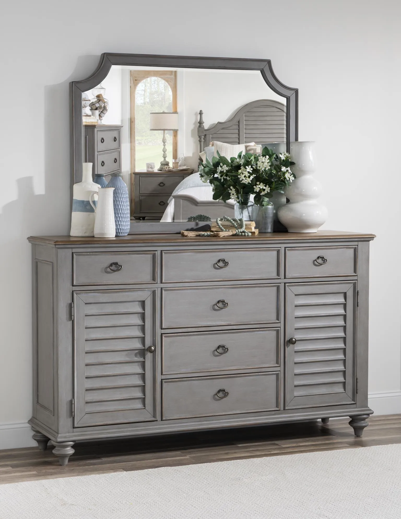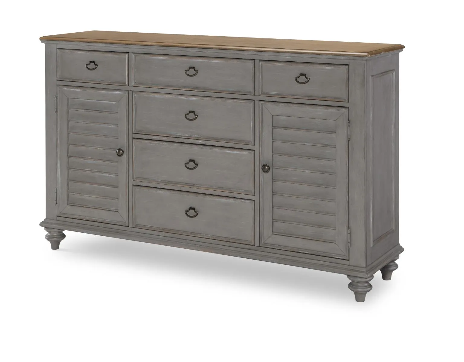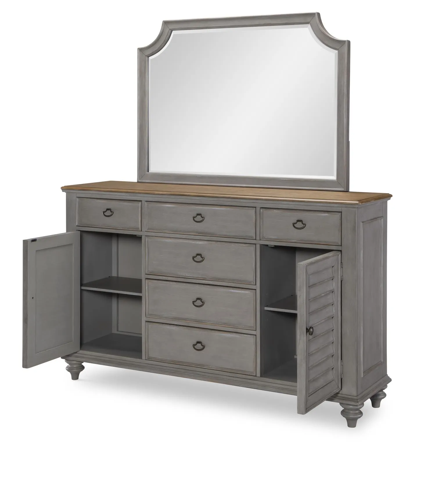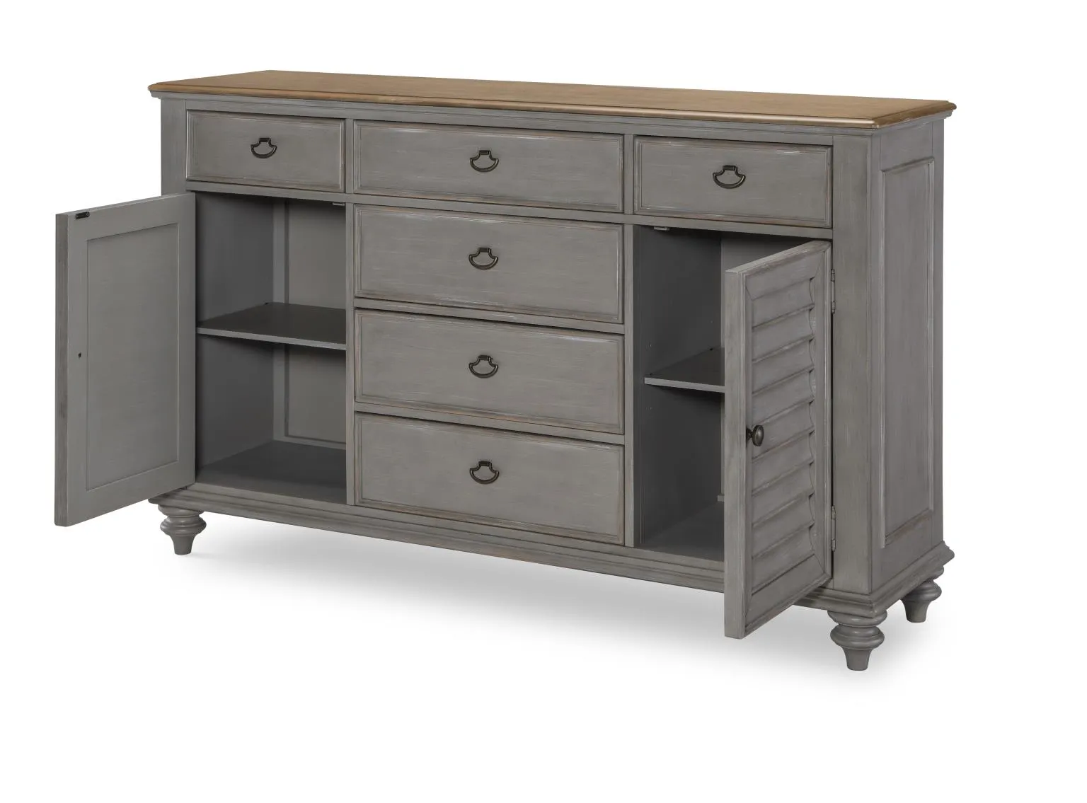 Louvered Dresser, 6 Drawers, 2 Doors w. 1 Adj Shelf, Felt Line Top Drawers, Cedar Lined Bottom Drawers, Jewelry Tray Top RSF