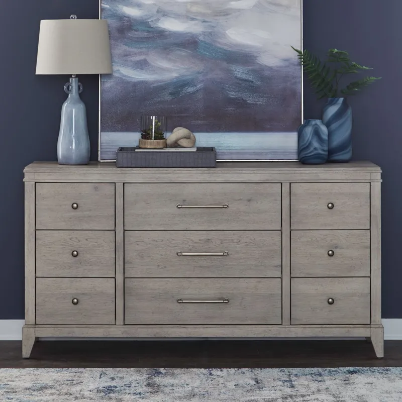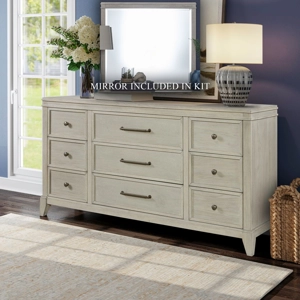 The New Haven 9-drawer dresser combines functionality with sophisticated design. Crafted from Rubberwood solids and Small Split Heart White Oak veneers in a Sanctuary White finish, it features flat-front drawers accented with Champagne Silver bar pull and knob hardware. Elegant details include a double bead molding on the top apron and graduated step moldings on the bottom apron, flowing into angled tapered feet. Soft-closing drawer guides add an elegant touch, with premium felt lining in the top drawers and cedar-lined panels in the bottom drawers for added luxury and storage versatility.