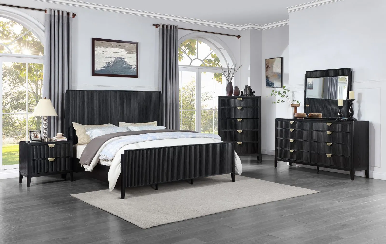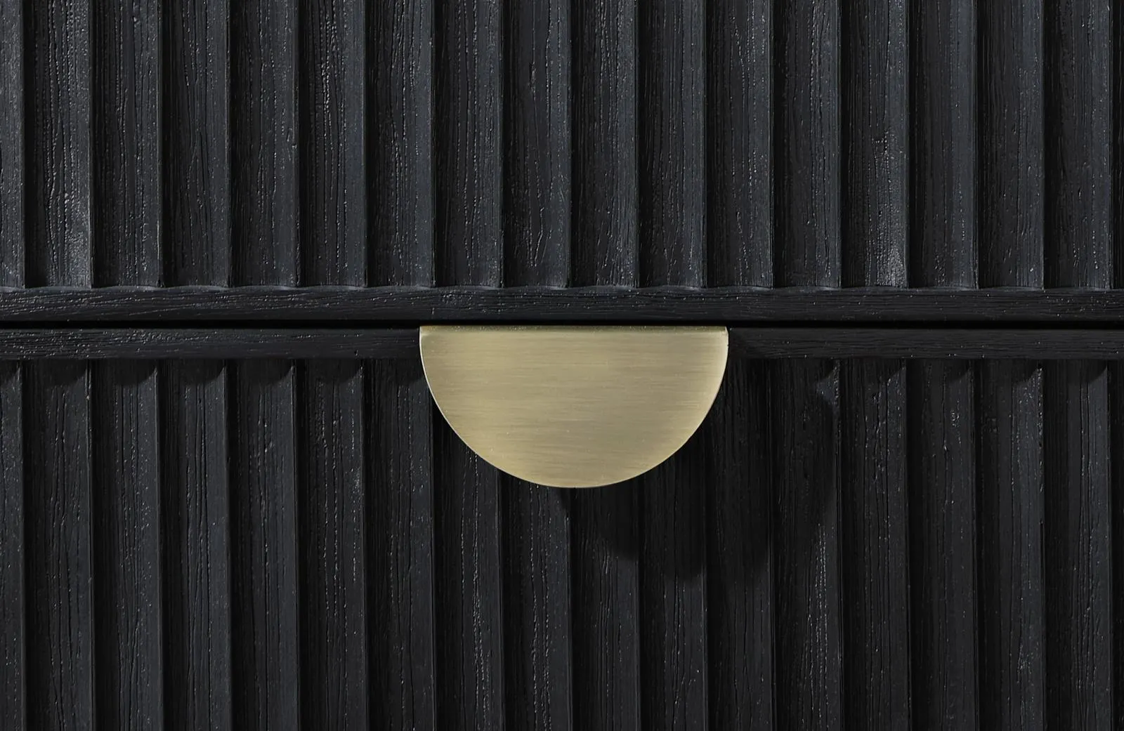 Augment your sophisticated bedroom with the addition of a modern two-drawer nightstand. It boasts a classic stance, with two drawers that offer a place for overnight essentials and personal necessities like books. The top drawer includes felt lining while half-moon pulls add metallic contrast with a soft golden hue. Drawer fronts are fluted, offering impressive texture and dimensionality at your bedside. Its black finish is wire brushed, adding the perfect touch of texture and depth.