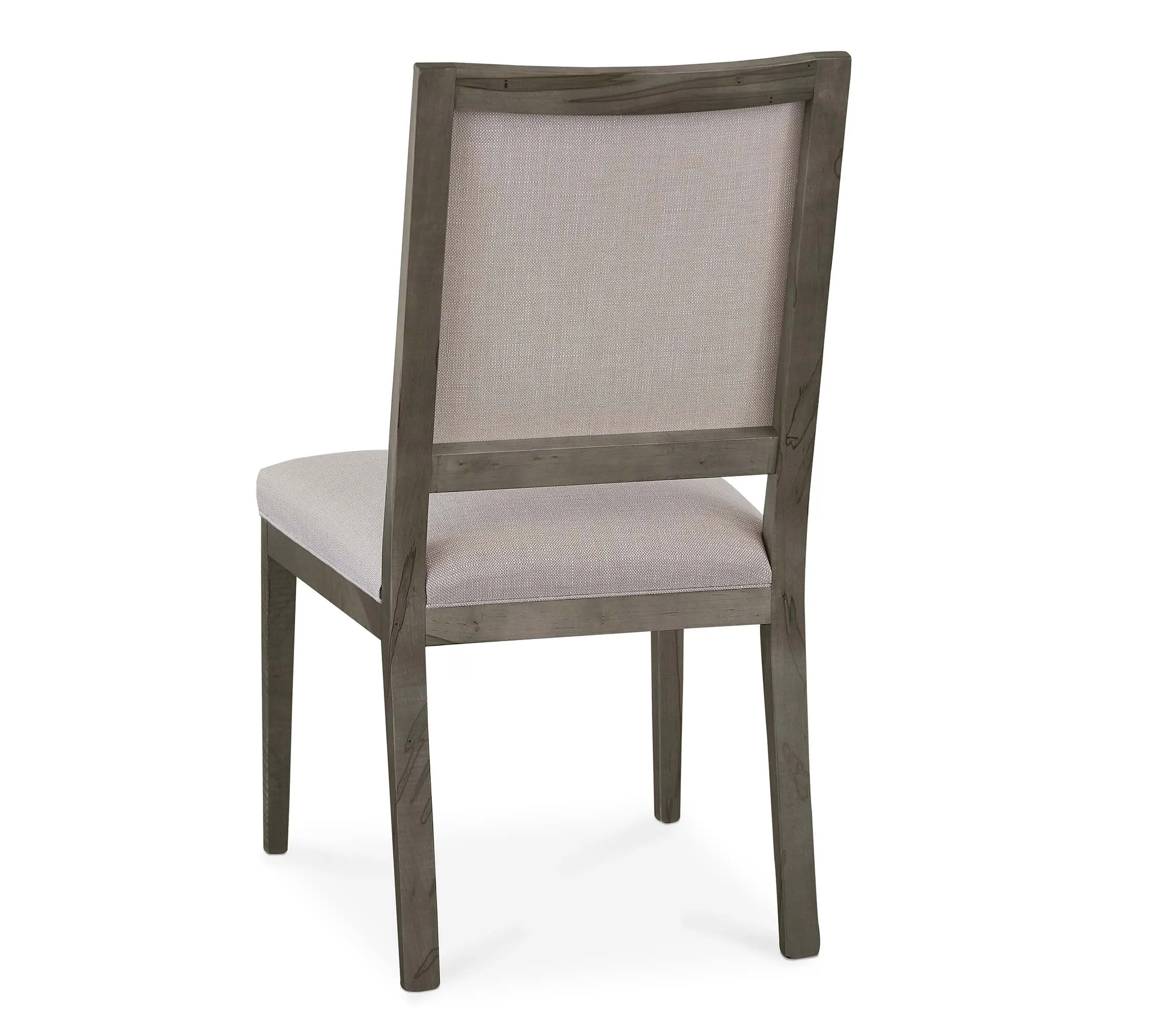 Solid maple Samson side chair by BenchMade offers a modern take on a classic French style. Constructed from a solid maple frame, the square upholstered back is framed with solid maple, and finished with tapered legs. Choose from finishes ranging from greys and whites to deep browns, all lightly distressed. Seat construction is sinuous wire springs for added comfort. Choose from a curated collection of performance linen and velvet fabrics in a wide range of colors or select from five buttery soft leathers in stylish colors. Fabric and finish choices available in store. 20"W x 26"D x 39"H Shown in Greylan Maple.