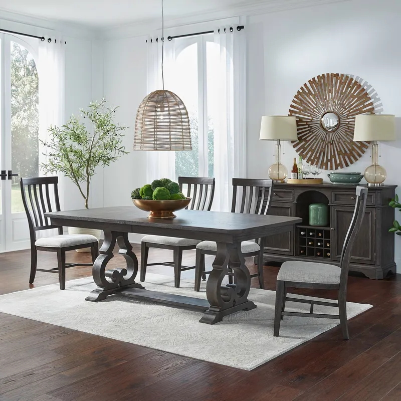 - Includes Trestle Table & 4 Slat Back Side Chairs