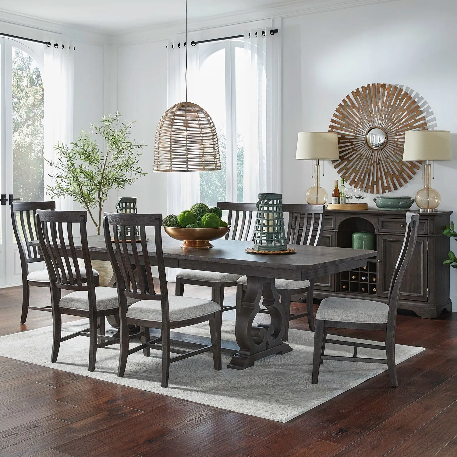 - Includes Trestle Table & 6 Slat Back Side Chairs