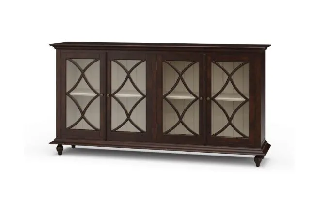 A pair of curves X's on each glass door add detail and sophistication to the Hamilton 4-Door Buffet. Built beautiful in mahogany and iron with brass hardware, this buffet is a stunning addition to the dining area. This piece is offered with a vast array of finish and distress options to create a truly custom design.