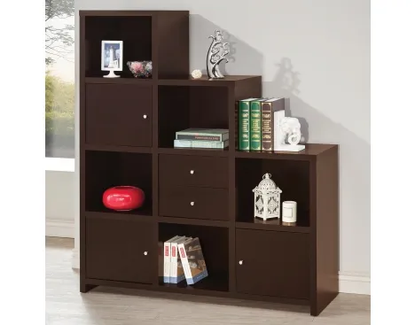 Art meets architecture to deliver a stunning and useful home accessory. With a rich cappuccino finish, this bookcase highlights a fun staggered silhouette mimicking a staircase. Perfect for both a bedroom and a main living space, it offers a variety of options for storage and display. Find open room on three top surfaces and in five open compartments. Tuck away essentials behind three doors and in two center drawers with smooth Euro glides.