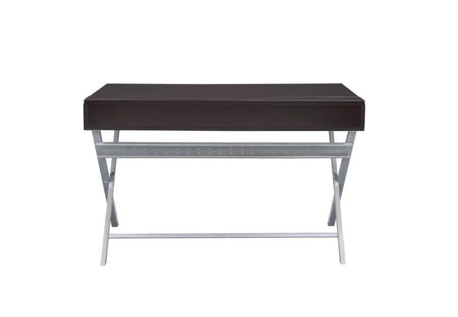 Tasteful design elements tell the story of an optimal choice for a home office. This writing desk offers a perfect setup for computing, task-mastering, and general organization. A cappuccino finish delivers a dramatic look with versatility, and matches perfectly with a silver X-shape base. Store essentials in side drawers with Euro glides for smooth operation, and in an open center compartment. Enjoy tech upgrades with a power outlet concealed within lift-top storage space.