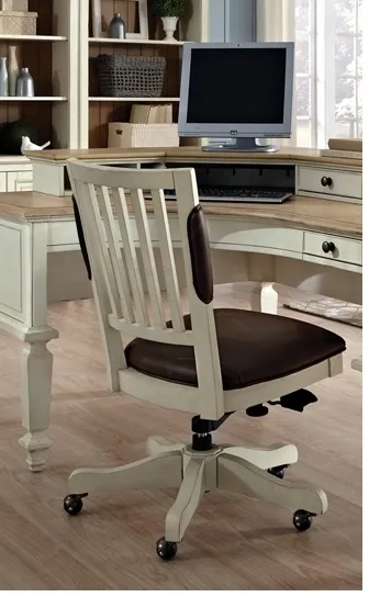 Office Chair Bonded leather pads on back of chair; The Ravenwood collection comes in an antiqued white finish; With hardwood solids and white oak top veneer