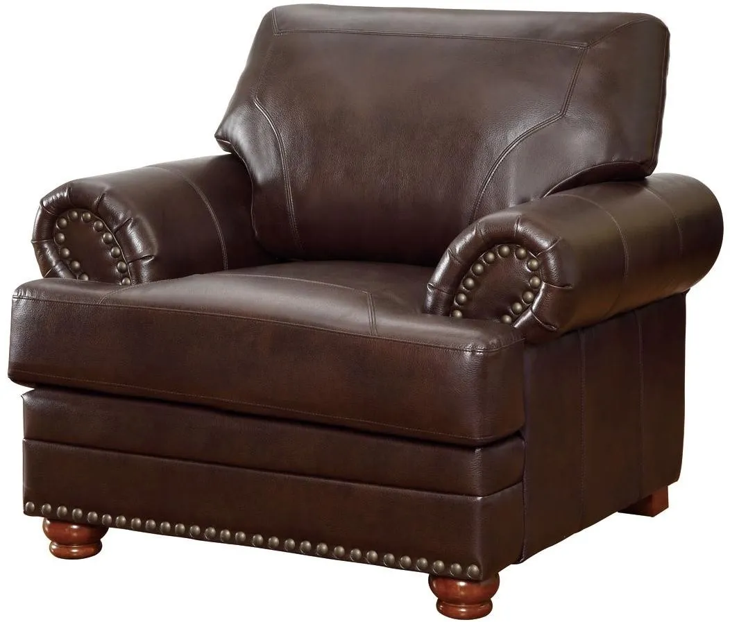 Offer comfortable seating in a traditionally styled living room or den. A classic silhouette and list of ornate features define the elegance of this stylish chair. Wrapped in brown bonded leather match, it reflects a brilliant sheen and offers easy care. Nailhead trim around its rolled arms and bottom edge stylize with traditional flavor and charm. Join coordinating pieces in a seating ensemble, or place this as a standalone piece in a reading nook or study.