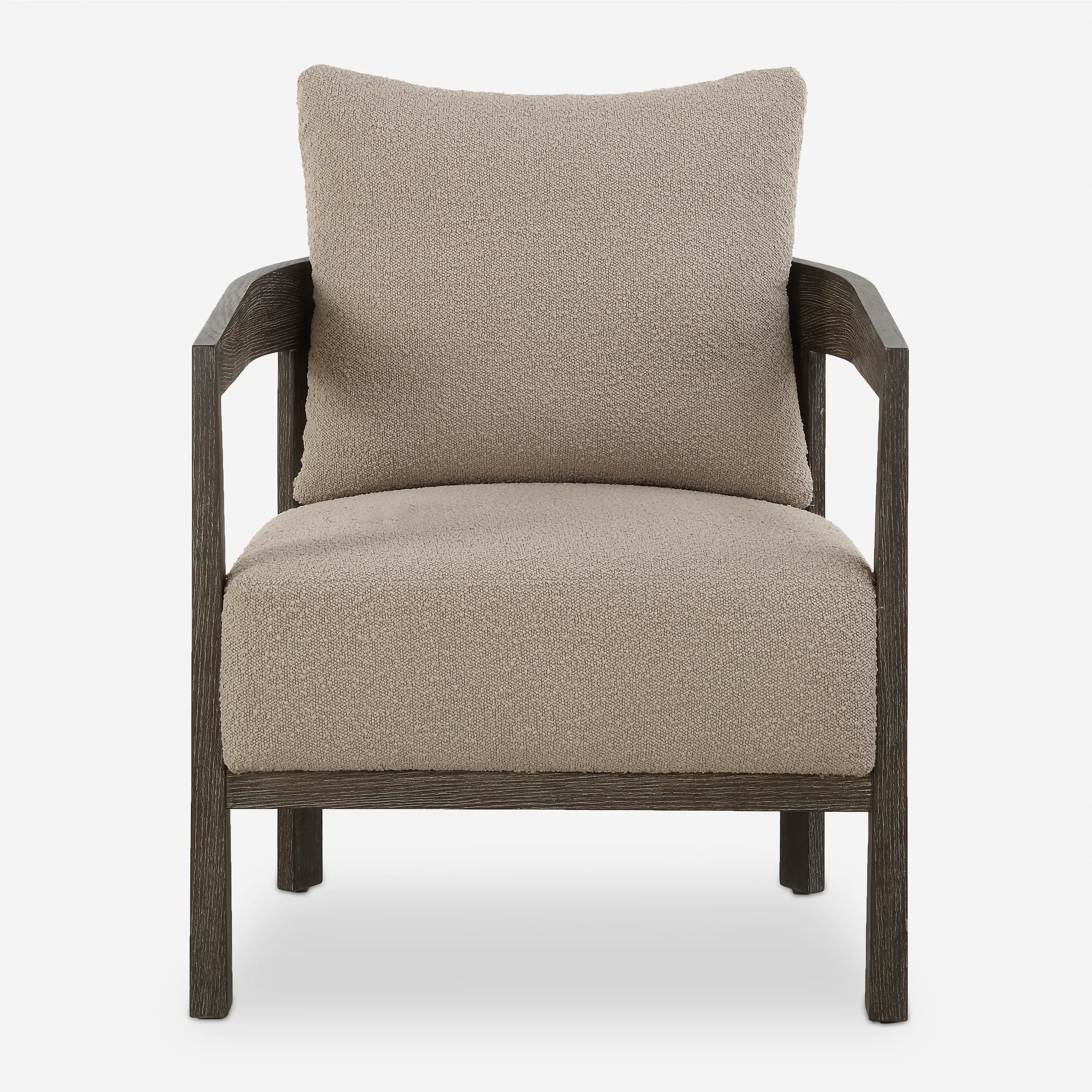 Sink Into The Comfort Of The Sienna Accent Chair. Modern Lines Of The Solid Oak Barrel Frame Are Softened With An Upholstered Seat And Support Pillow. Stained In Rich Cocoa, Paired With A Dark Sand Toned Polyester Boucle Fabric. Seat Height Is 19".
