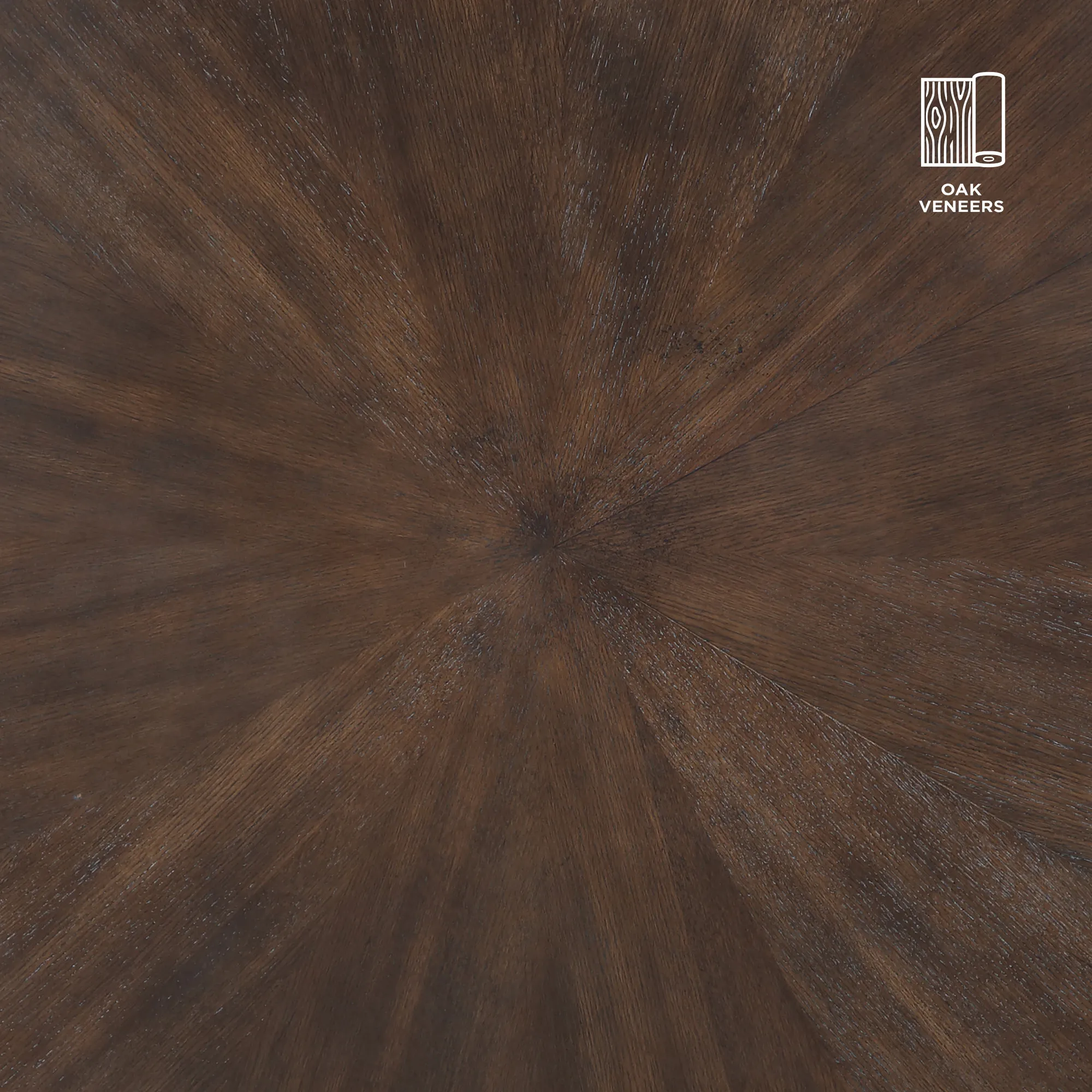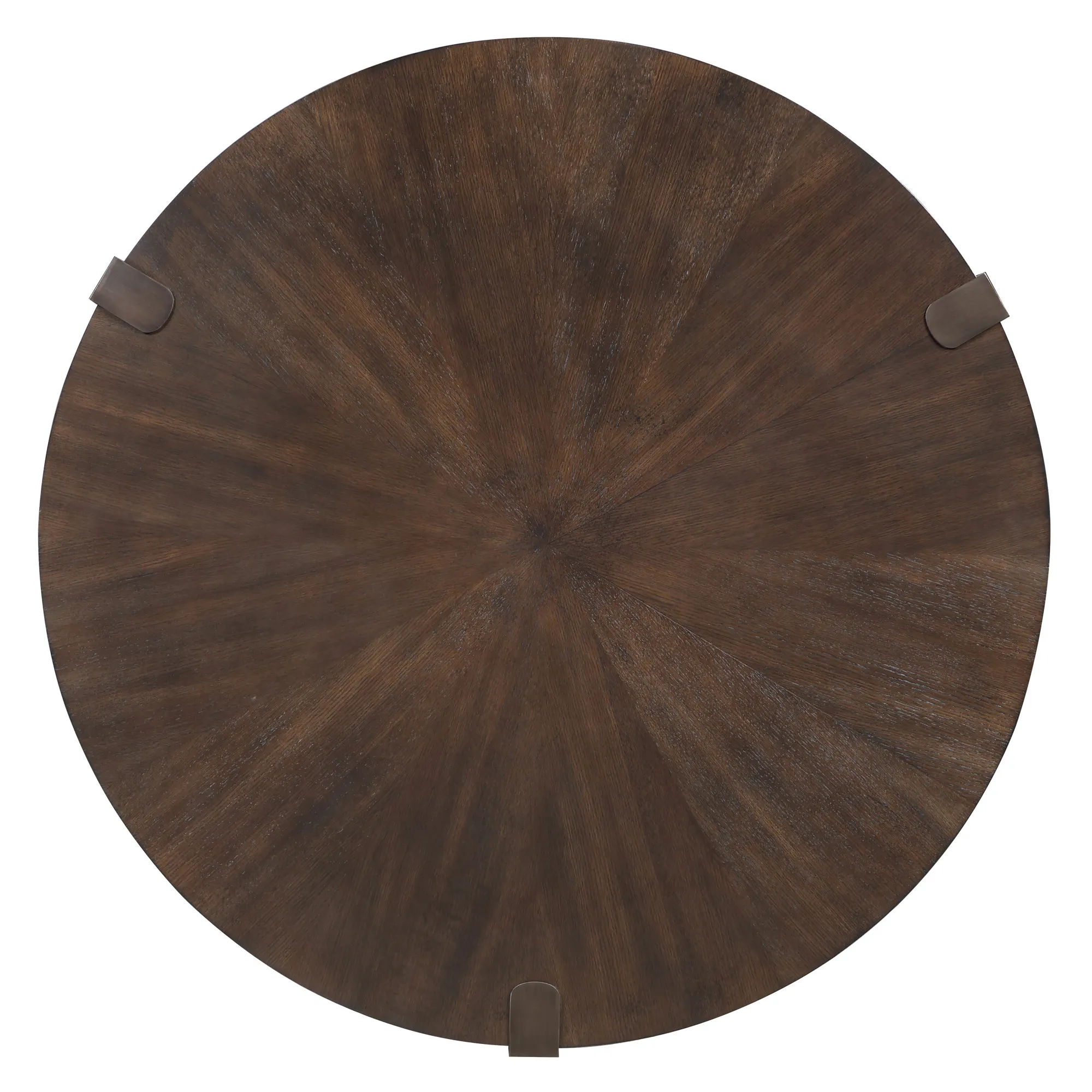 Elegant and commanding, the Gracie Brown Coffee Table is a stunning blend of modern industrial charm and elegant design. This elegant and commanding 48-inch round table stands proudly on three monochromatic copper finished metal legs, geometrically shaped and exposed on top, adding a bold, contemporary look. Its round, flowing silhouette with an espresso finish showcases oak veneers in a mesmerizing sunburst layup. Rich and inviting, this distinctive piece enhances any space with its impressive size and striking design, bringing both style and functionality to your room. Ideal as a centerpiece, it effortlessly combines beauty and utility.