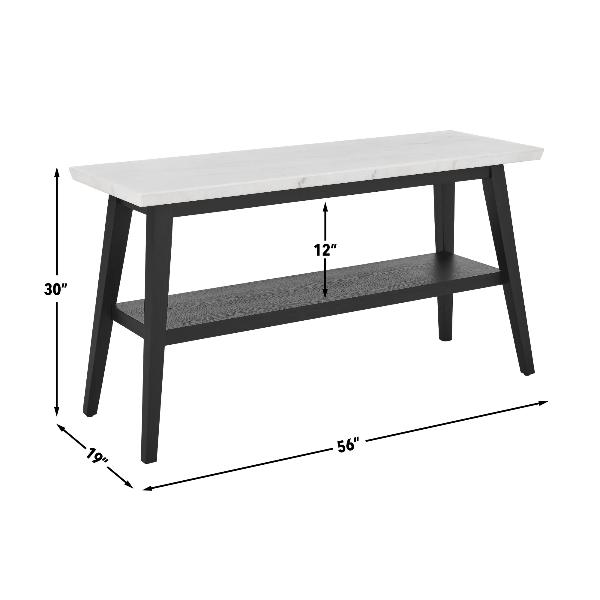 - Styling details include knife edge marble top, canted solid wood legs and bottom shelf for storage or display