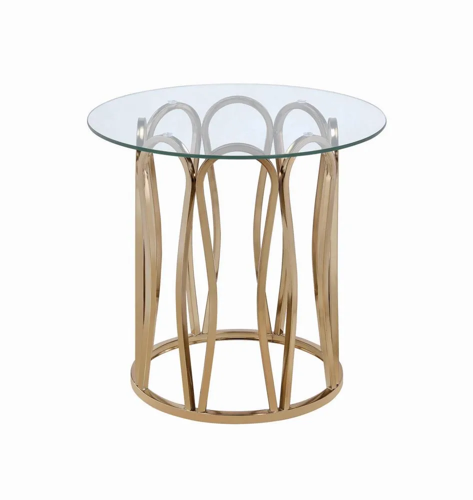 A light and airy ambiance offers elegance and taste. This charming end table plays on an artistic theme and blends beautiful materials. A round glass top perfects the contemporary theme you're after. Enjoy a decorative base with shaped pieces in a warm chocolate chrome finish that capture attention. Add a delightful accent to a modern living area with this tasteful end table.