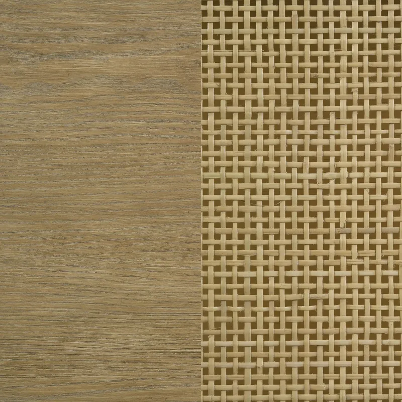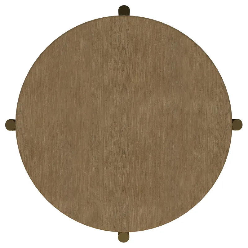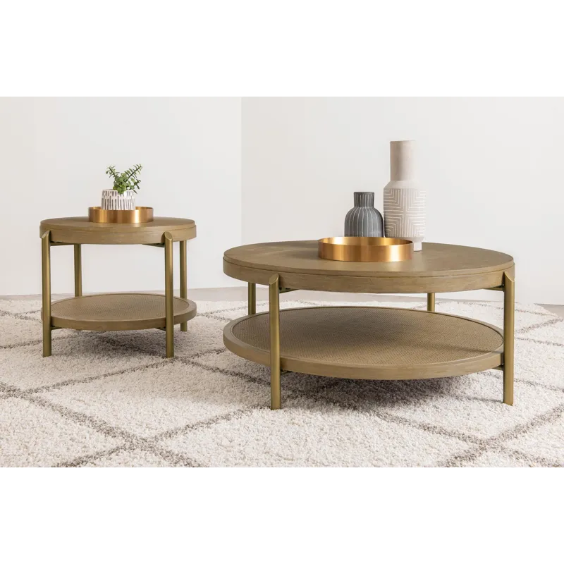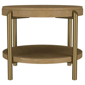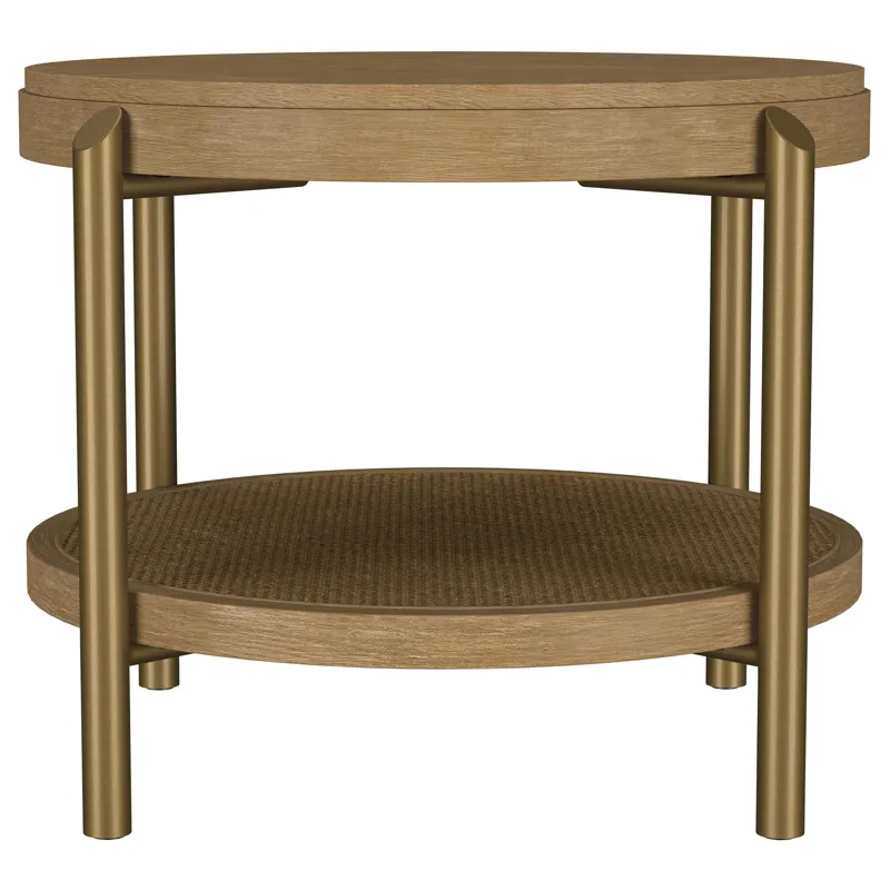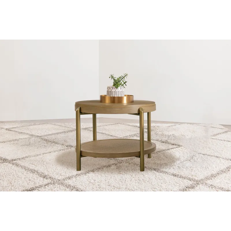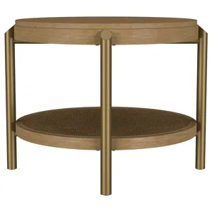 This round end table showcases a refined blend of natural and industrial elements, perfect for modern interiors. Crafted from rubberwood, engineered wood, and ash veneer, its finish highlights the table's organic grain for a subtle, rustic appeal. The lower shelf features natural woven rattan, offering functional storage with a stylish touch. Sturdy aged brass-finished metal legs provide contrast and durability. Ideal as a side table or accent piece, it combines elegance and utility effortlessly.