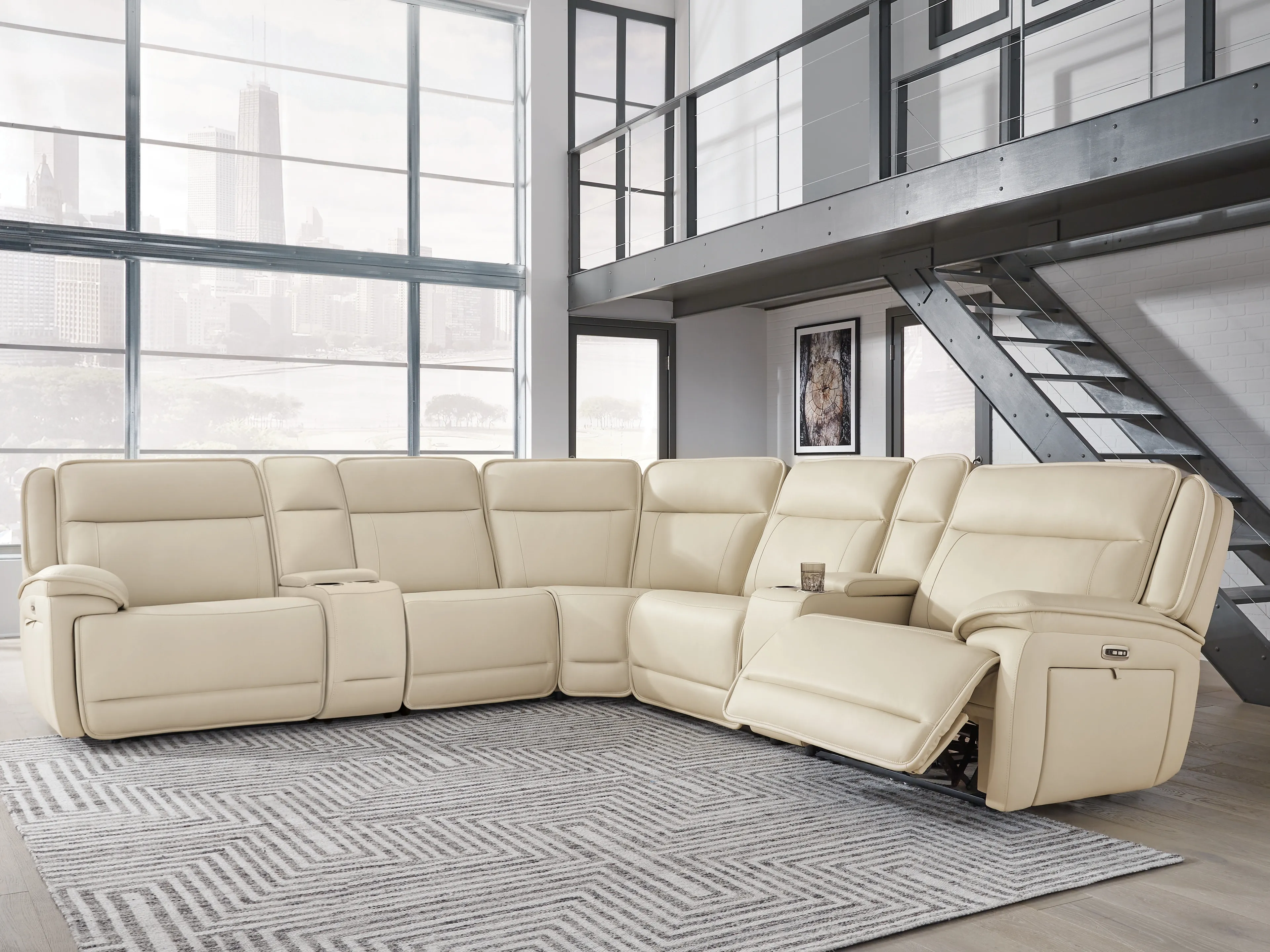Includes 7 pieces: left-arm facing power recliner, 2 consoles with storage, power armless recliner, armless chair, wedge and right-arm facing power recliner