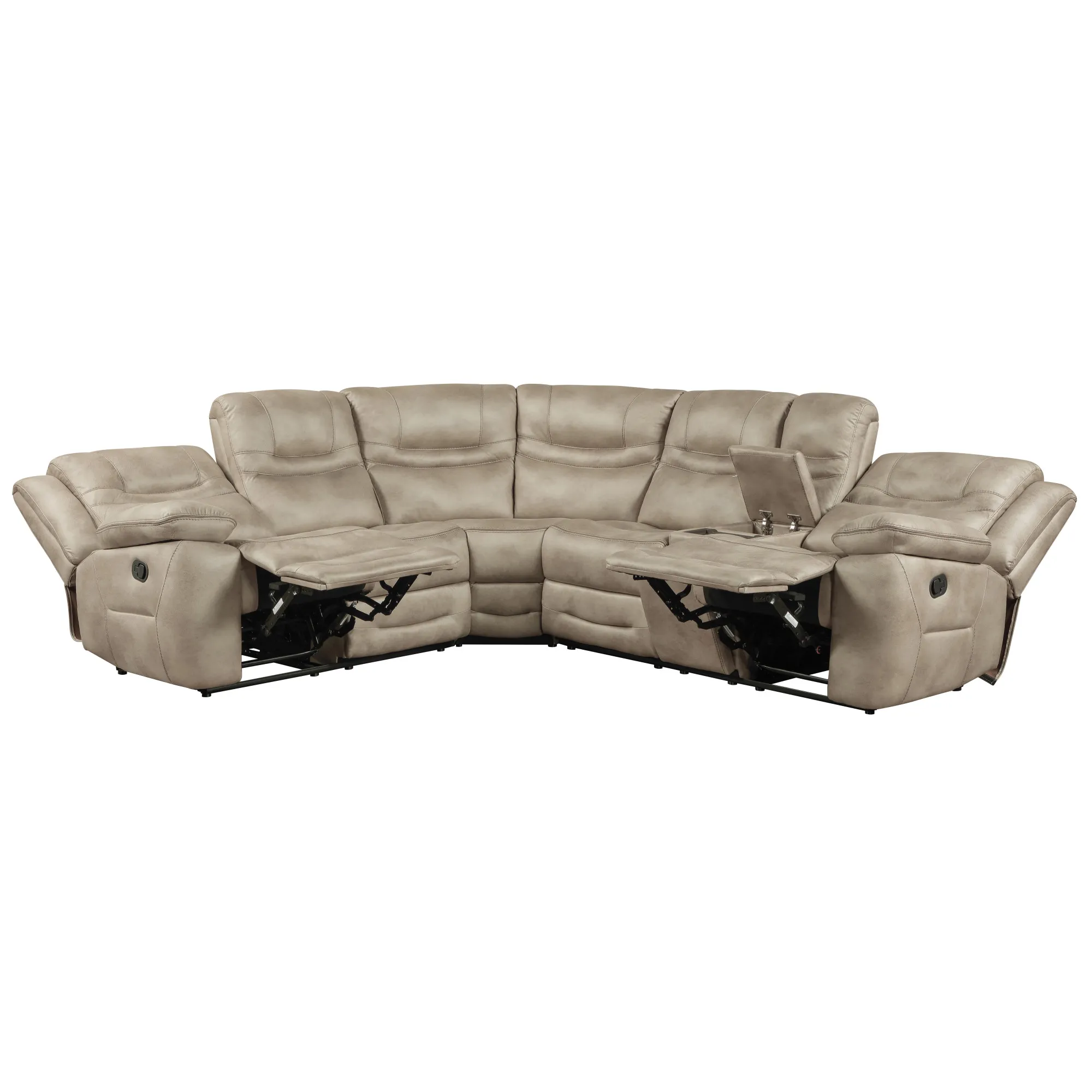 The Shelton 3-Piece Manual Reclining Sectional blends plush comfort with smart functionality. Upholstered in soft camel polyester, it features two outer reclining seats that extend to a 135-degree angle with just 3 inches of wall clearance. The Right-Arm-Facing Loveseat includes a lift-top console with a wireless charging surface, hidden storage, and two stainless steel pop-out cupholders. Generously padded arms and headrests ensure lasting comfort, while mottled fabric and arched stitching add a tailored, stylish touch to this versatile sectional.