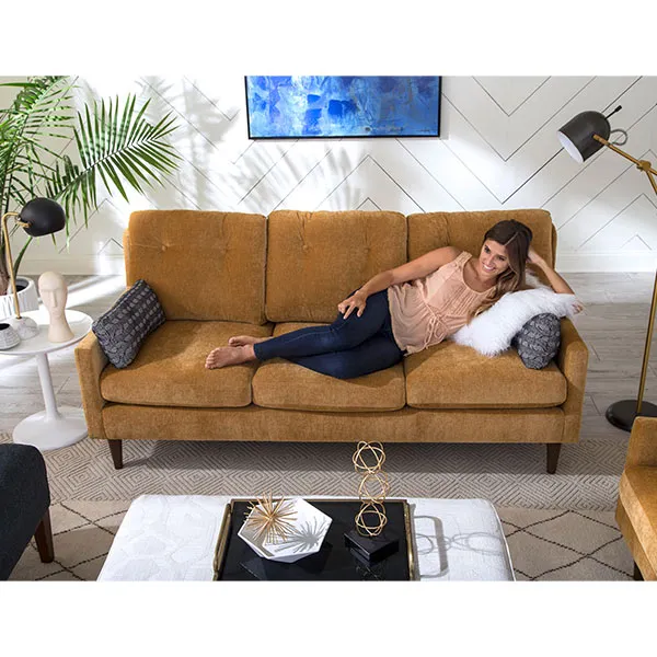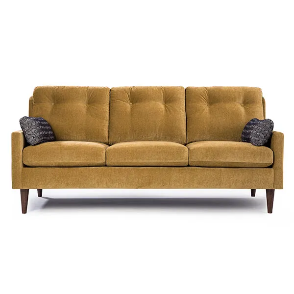 Style description: It's all in the details, from the chic tapered legs to the clean lines and beautiful buttoned back cushions, the Trevin Sofa will be the centerpiece in any space.This collection is the perfect mix of comfort and style. Choose from an assortment of finishes for the tapered wooden legs and over 700 fabric options or select top grain leathers for endless customization possibilities. Two pillows included in your choice of fabric or same leather for leather sofas.
