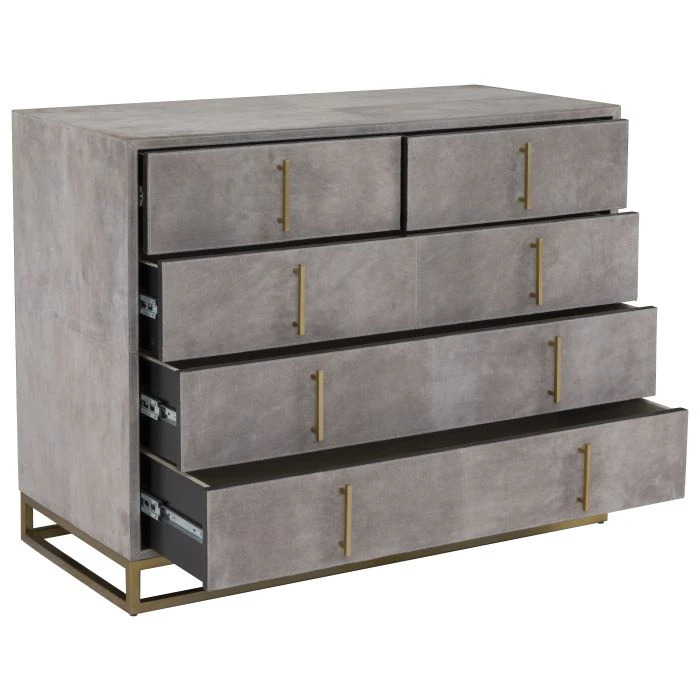 Five drawers. Suede leather wrapped with Aged Gold metal base. Ships with 1/4" lay-on glass top.