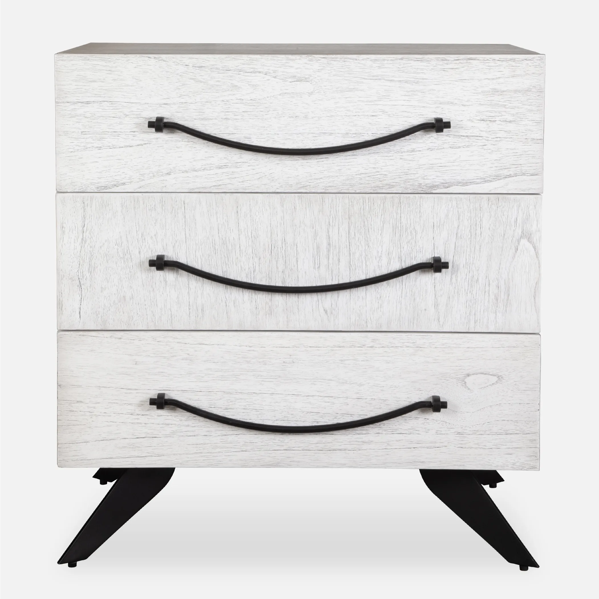The Vivi Three Drawer Chest Features A White Finish With Black Iron Accents. Displaying Alternating Mindi Veneer Directions Giving It A Playful Element, While The Wide Black Hardware And Matching Legs Add To Its Contemporary Look. Has Soft Closing Drawer Glides.