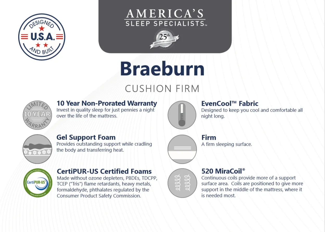 The Braeburn Cushion Firm Mattress by America's Sleep Specialists may be available at MillerHome Furniture & Mattress in the Falls Creek, DuBois and DuBois areas. Please contact us to check availability.