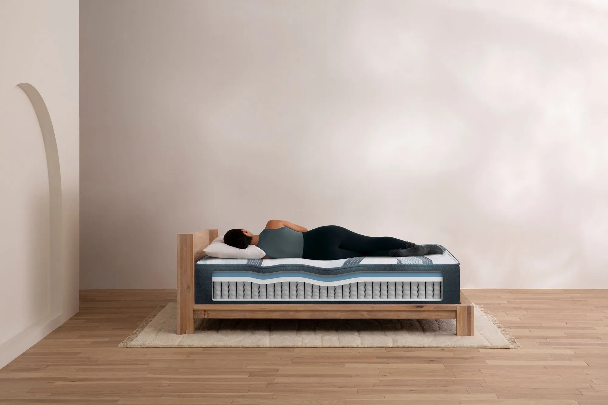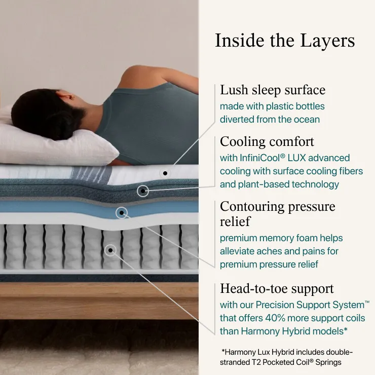 Experience support for more than just your body with the Harmony Lux Hybrid Collection. Innovative materials work harmoniously to bring you restorative sleep with improved support, advanced motion isolation, and a lush sleep surface made with plastic bottles diverted from the ocean. The Precision Support System™" offers 40% more support coils compared to Harmony Hybrid models for head-to-toe support across the entire mattress, so you and your partner sleep undisturbed. Up to 100 plastic bottles collected by hand from coastlines, oceans and ocean-bound waterways* have been transformed into premium fabric to create a lush, durable sleep surface that helps contribute to cleaner water. Infinicool® technology helps you stay comfortably cool all night with its one layer of plant based cooling technology. Pressure-relieving foams help ease aches and pains while also creating airflow throughout the mattress. Step-ups includes maximum cooing with bio-charcoal cooling foam and up to 2X more memory foam. All models are crafted with a smooth, body-contouring memory foam top perfect for anyone who loves the feeling of being cradled by their mattress and want rejuvenating sleep each and every night. *Collected from areas within 50km of coastlines. Plastic bottles collected vary by queen model ranging from 60 to 100.