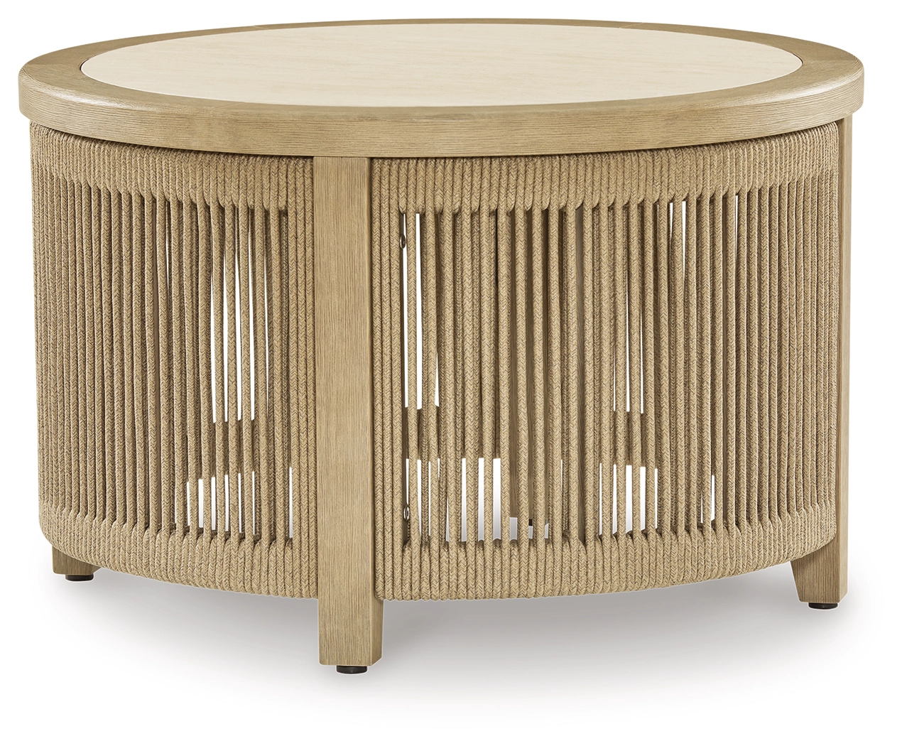 Kick back and relax with the contemporary vibe of this outdoor coffee table. Its rope detailing brings artistic flair, while the naturally beautiful eucalyptus wood provides must-have durability. And for added style and function, a cleanable stone-look tabletop completes the piece.